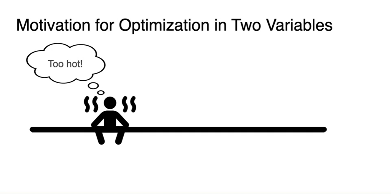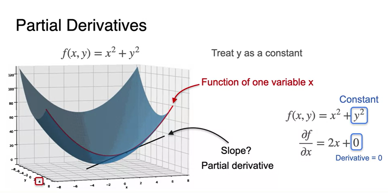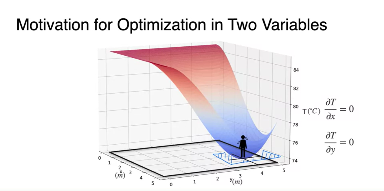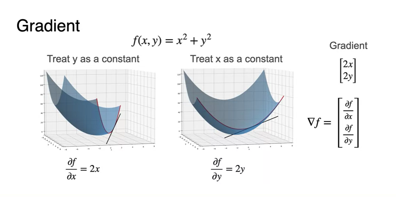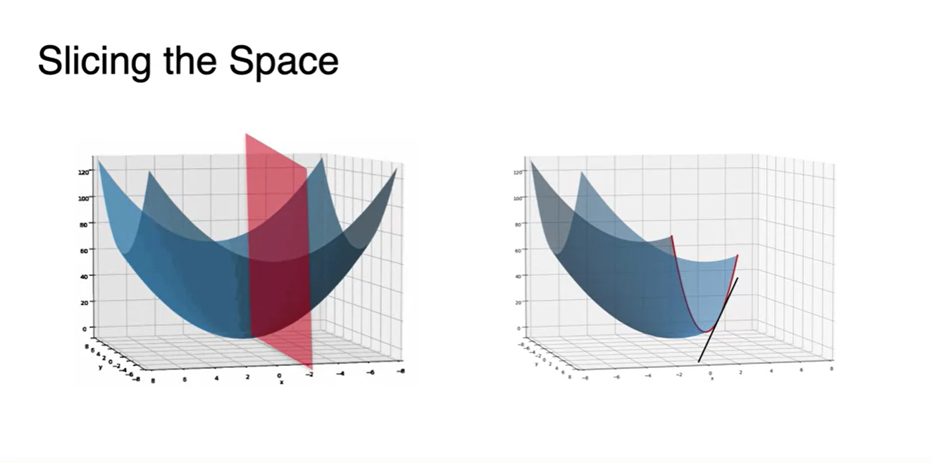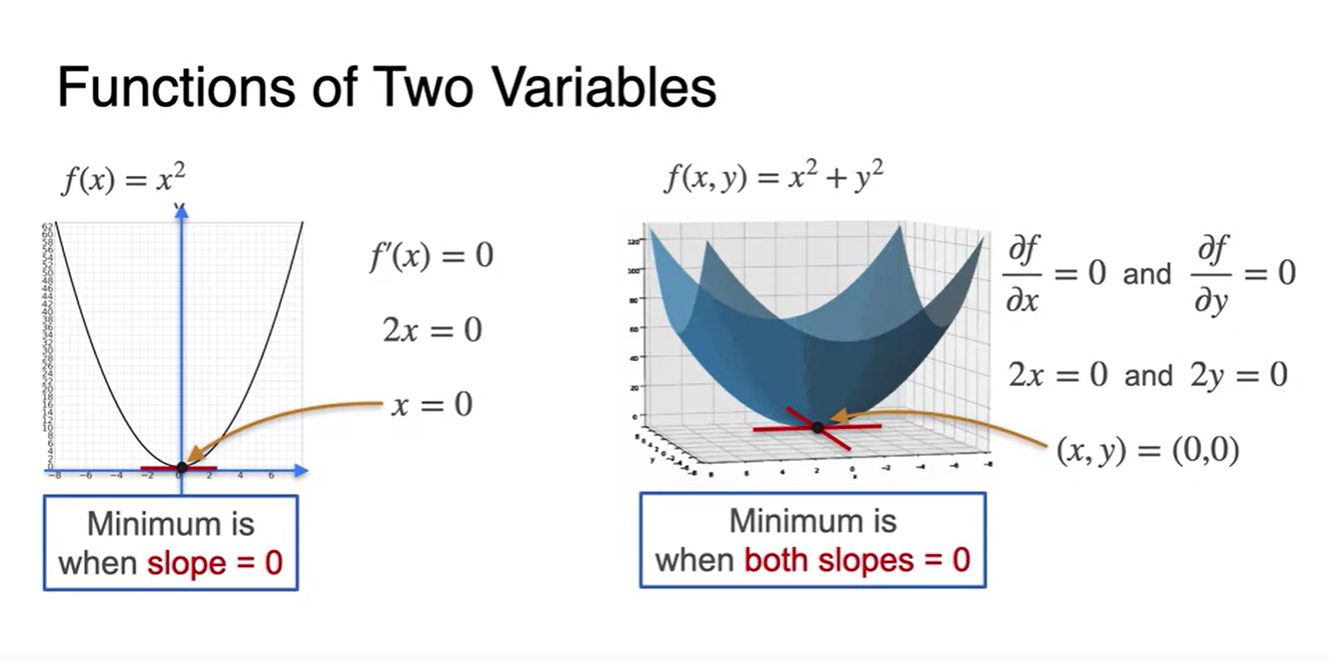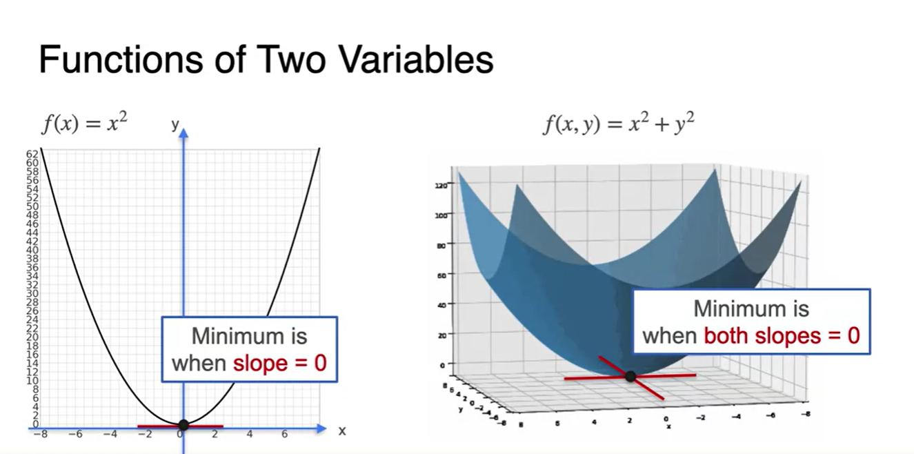 왼쪽 그림과 같은 변수가 하나인 function을 minimize하는 방법은 slope를 0으로 만드는 를 찾는 일이었다.
