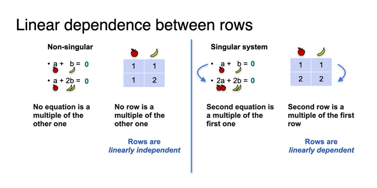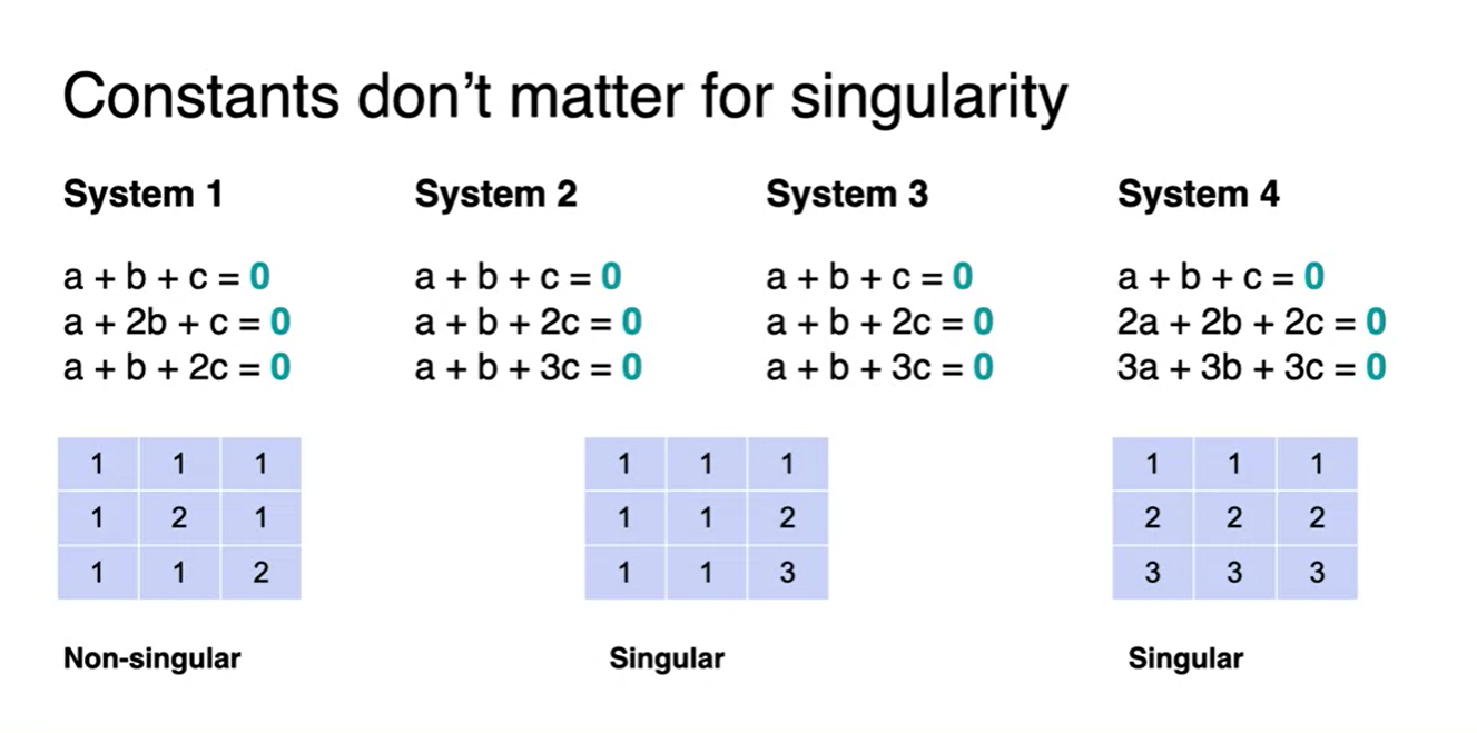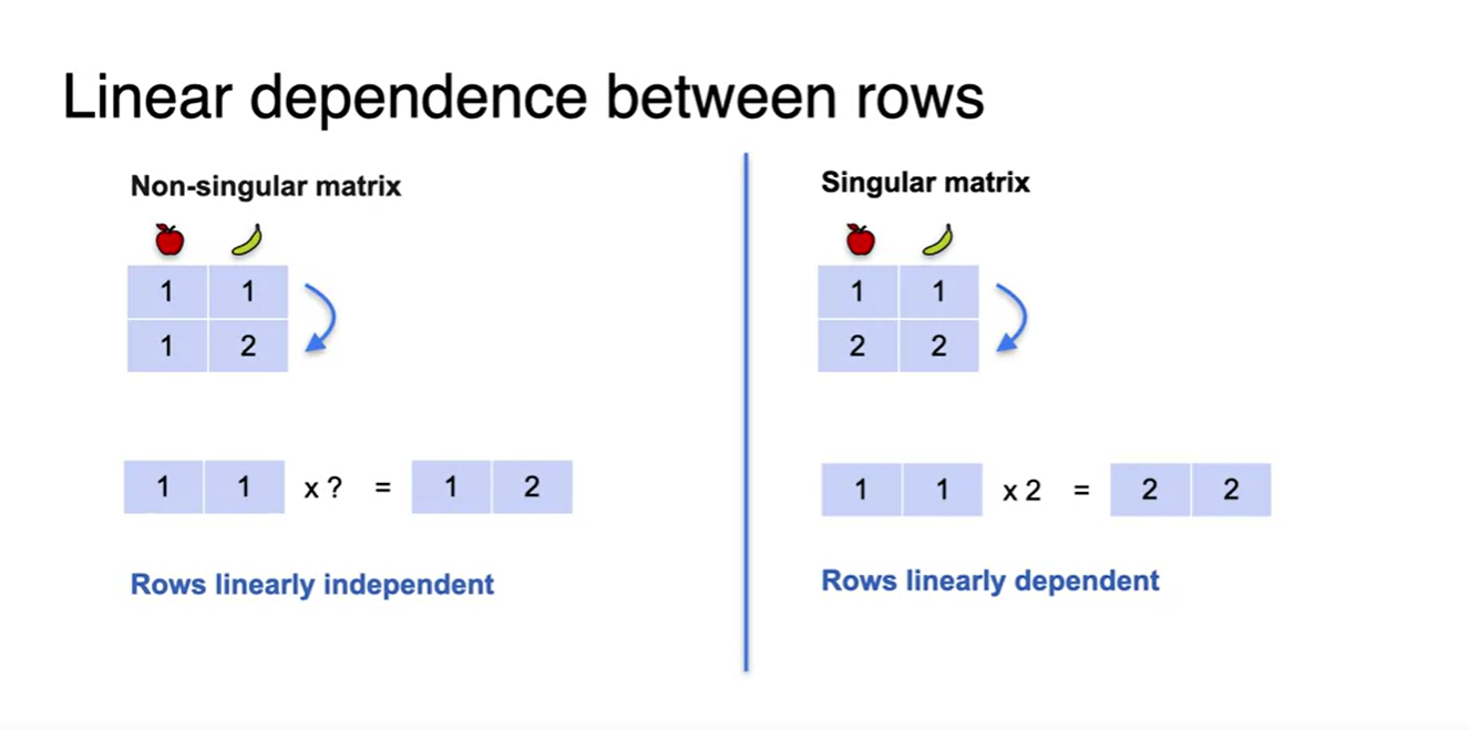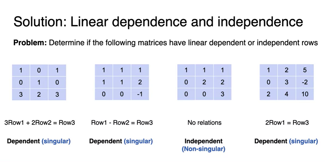앞서 각 행들의 관계가 하나의 constant를 곱하였을 때 같아진다면 Singular matrix이자 linerly dependent 관계에 있다고 본다.