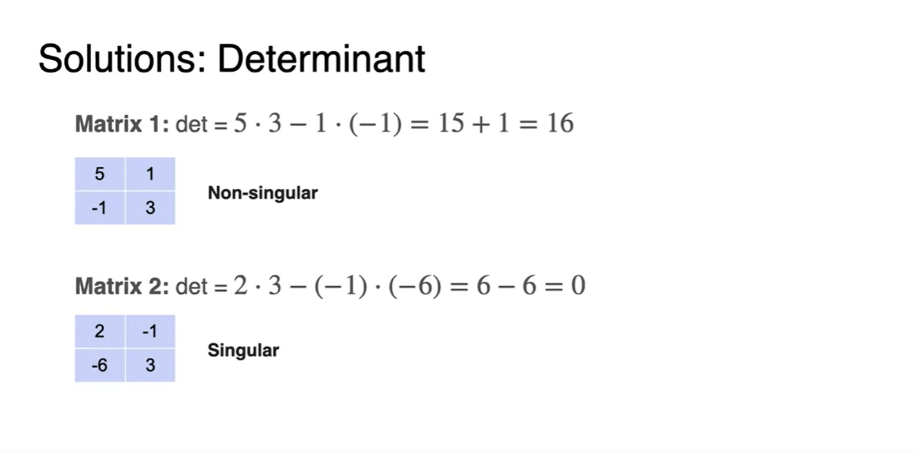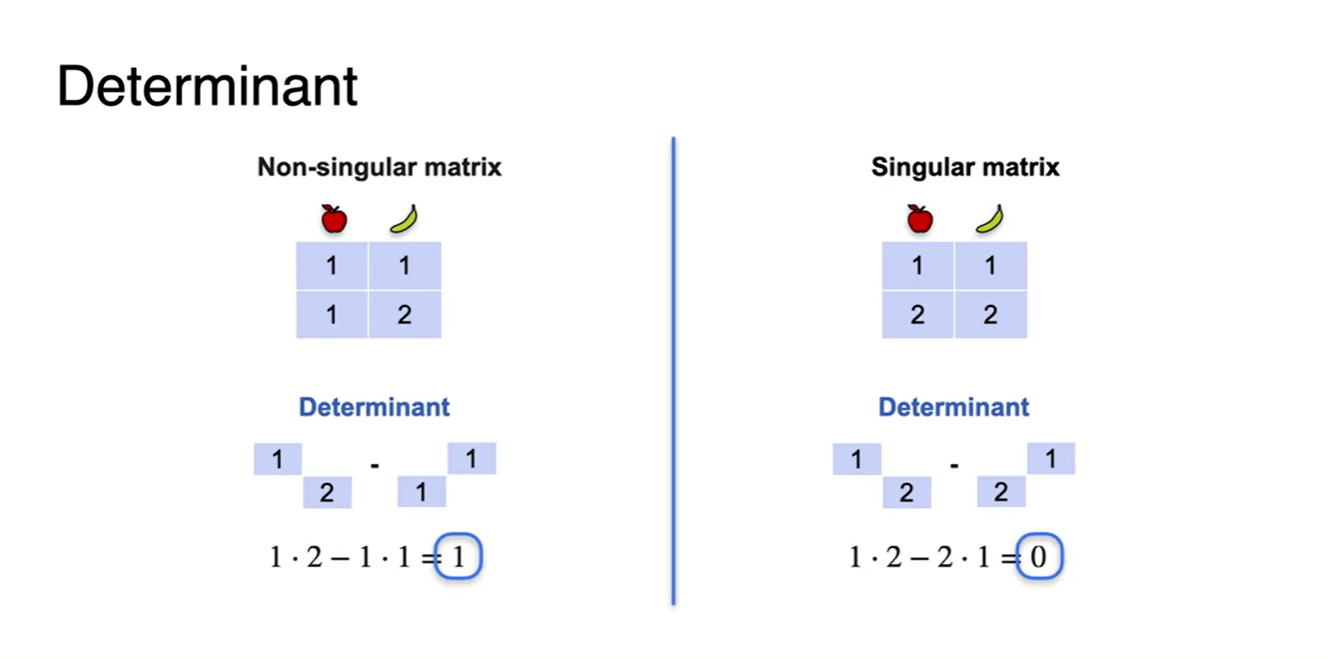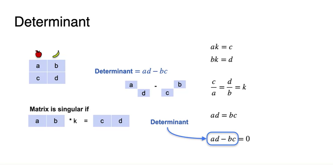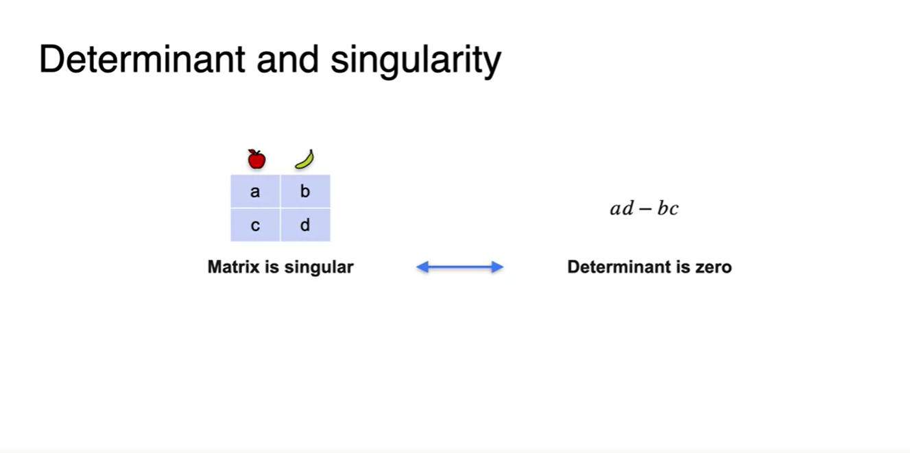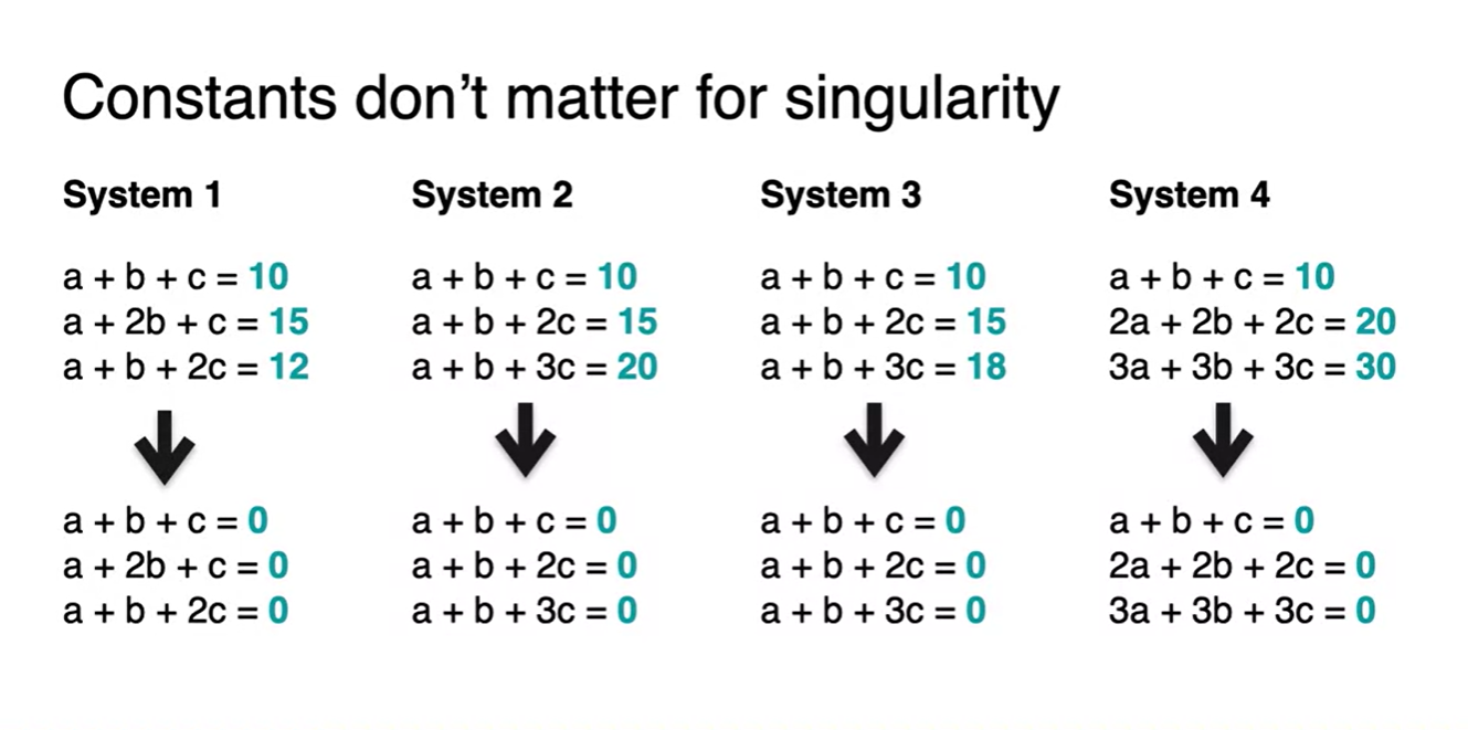앞서 각 행들의 관계가 하나의 constant를 곱하였을 때 같아진다면 Singular matrix이자 linerly dependent 관계에 있다고 본다.