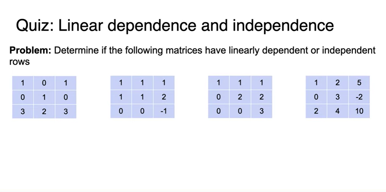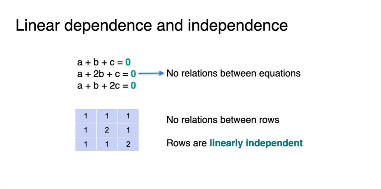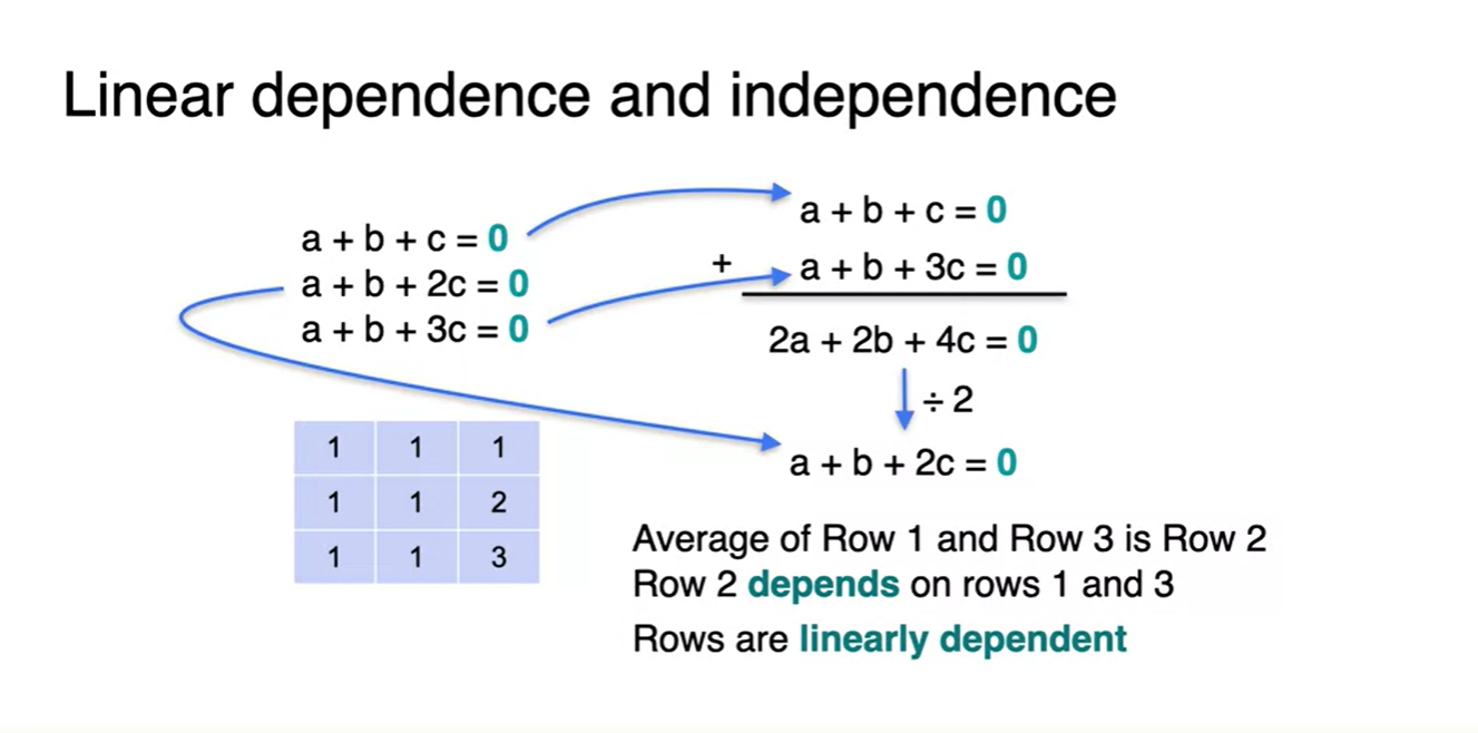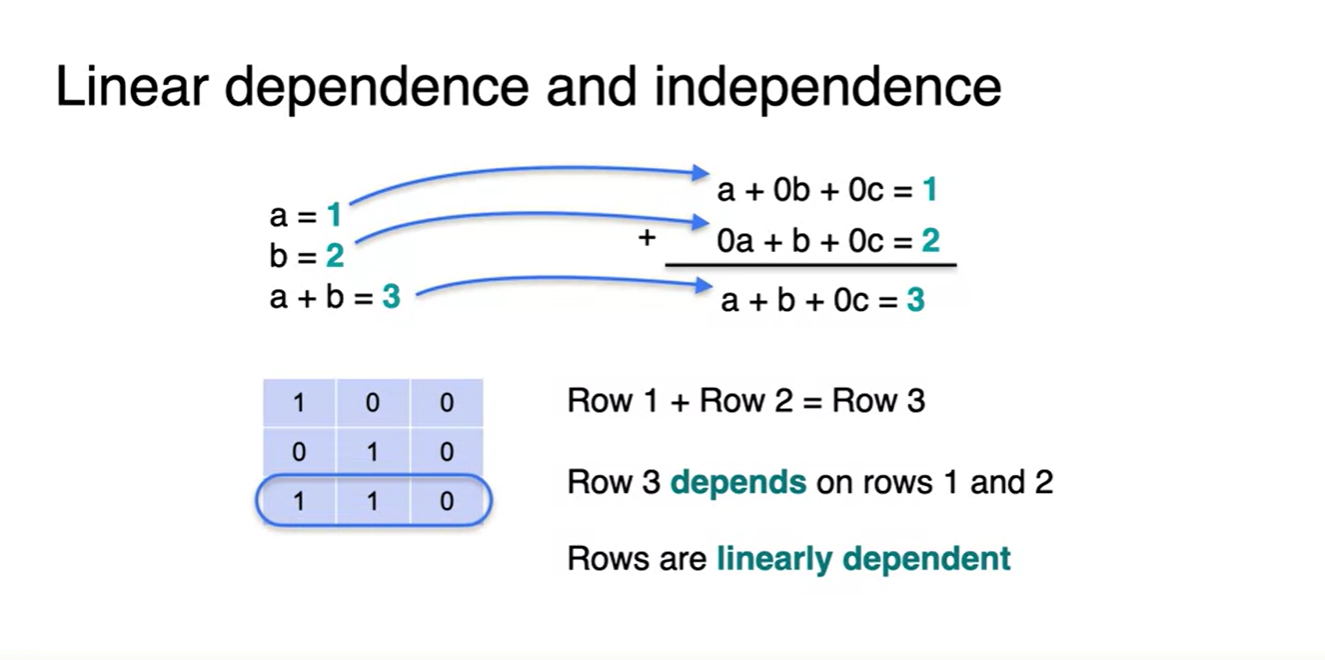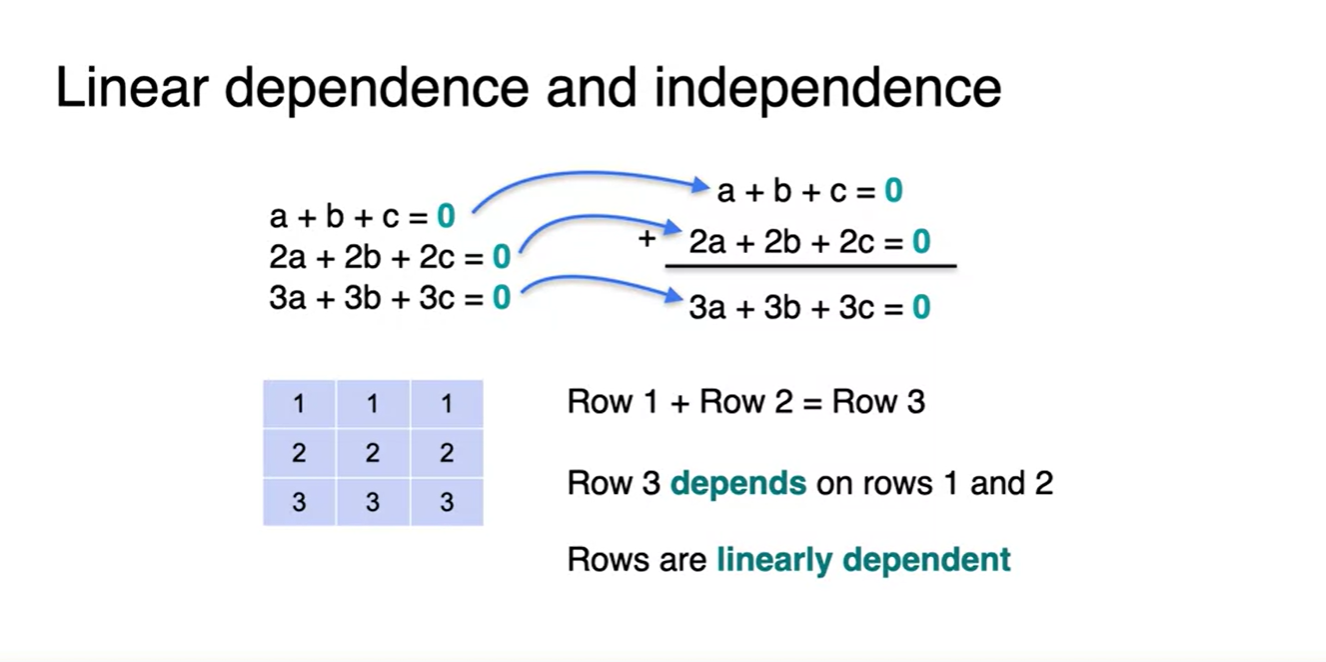 아래 방정식은 row1과 row2의 합으로 row3를 만들어 낼 수 있기 때문에 linearly dependent하다.