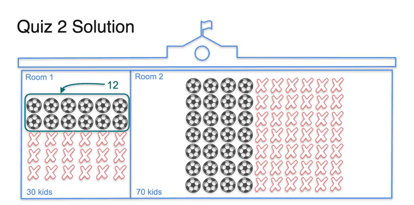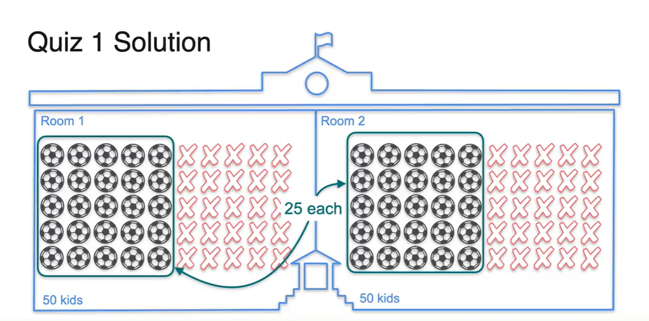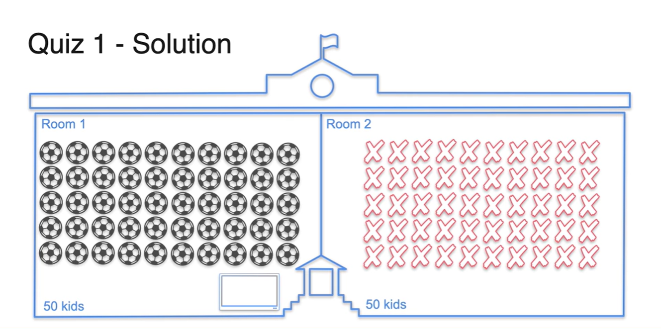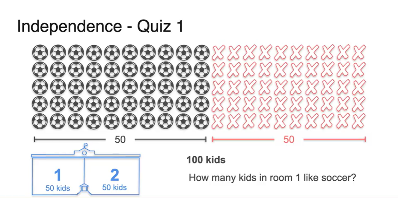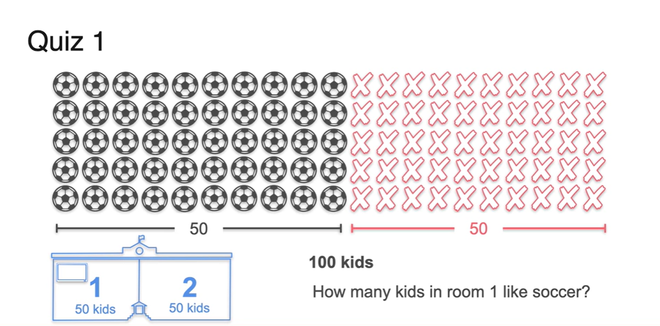 예를 들어 전체 학생이 100명인 학교에서 50명의 학생이 축구를 했고, 한 반에 50명씩 2반이 있는 상황이 주어진다고 가정하자.