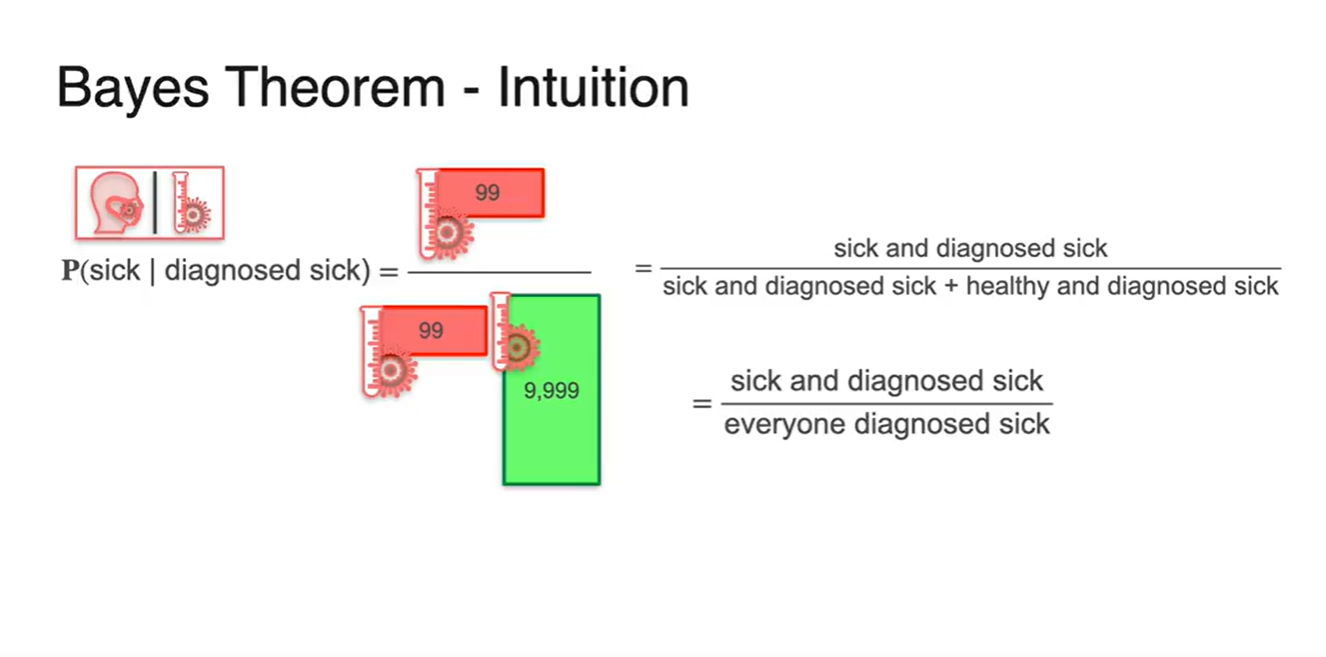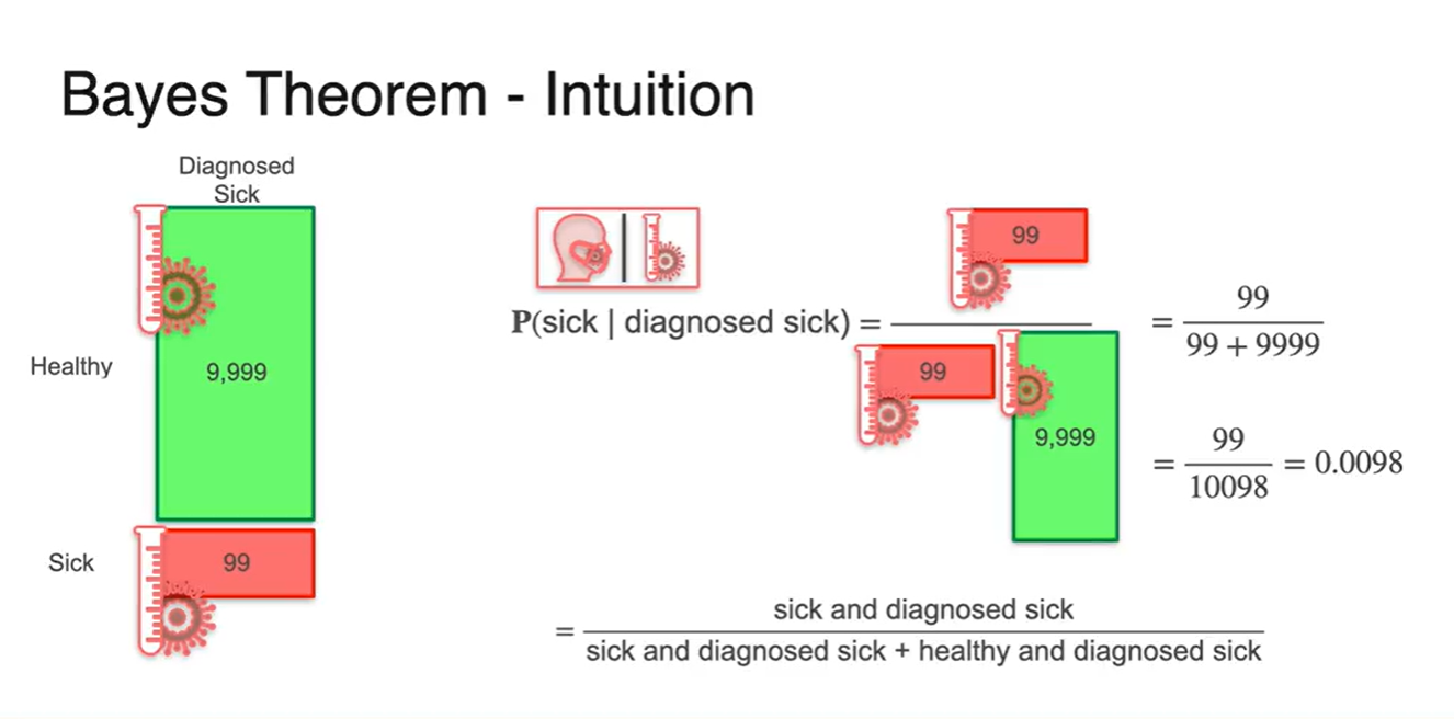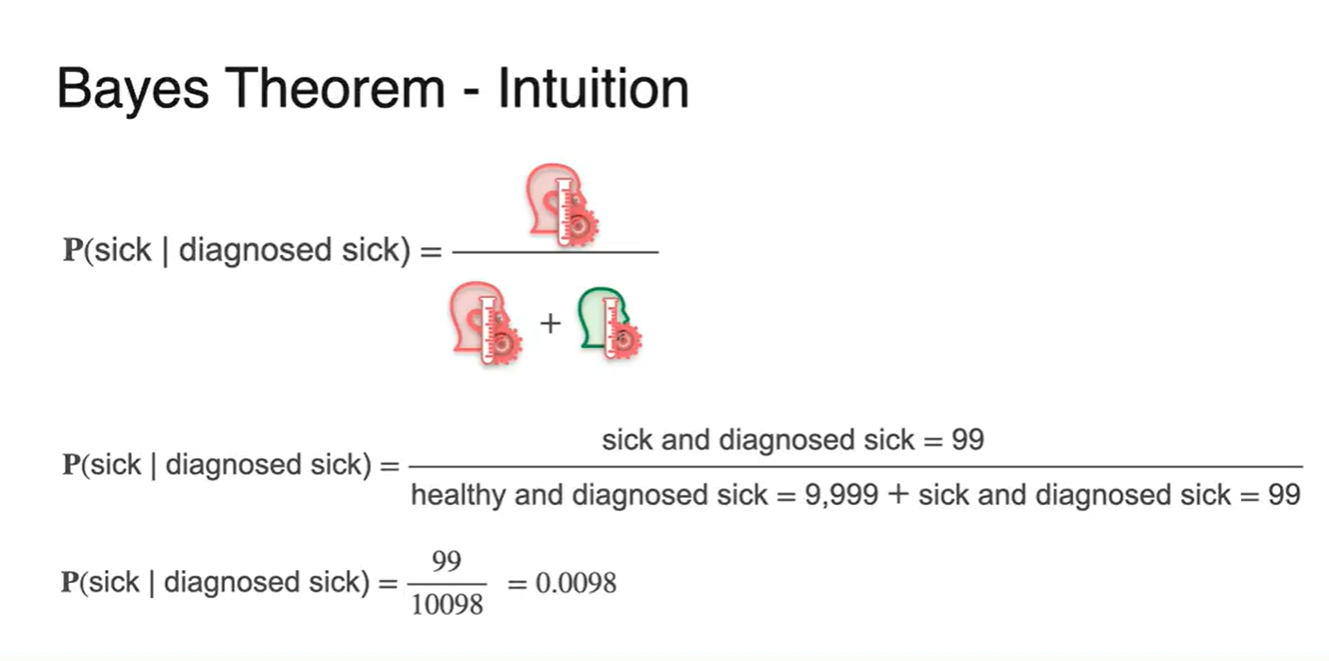 놀랍게도, 아프다고 진단받은 사람들 중 진짜로 아픈 사람일 확률은 0.0098로 계산된다.