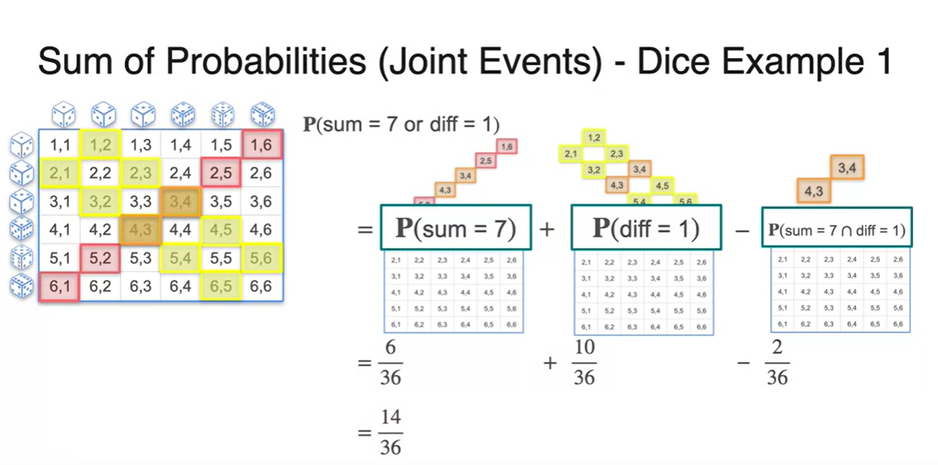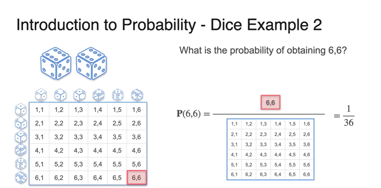 주사위 두 개를 이용하여 을 계산한다면 관측될 수 있는 모든 경우의 수가 36개로 세어진다.