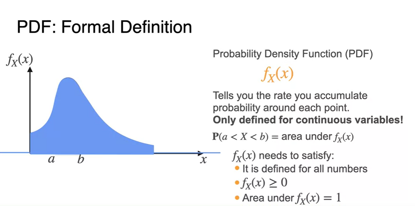 확률 변수가 continous한 경우, 구간의 확률 는 a부터 b까지의 아래 면적을 의미한다.