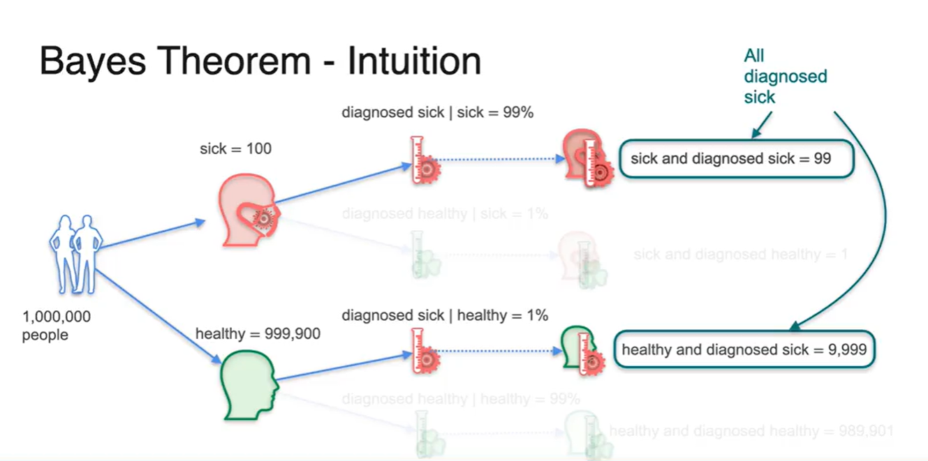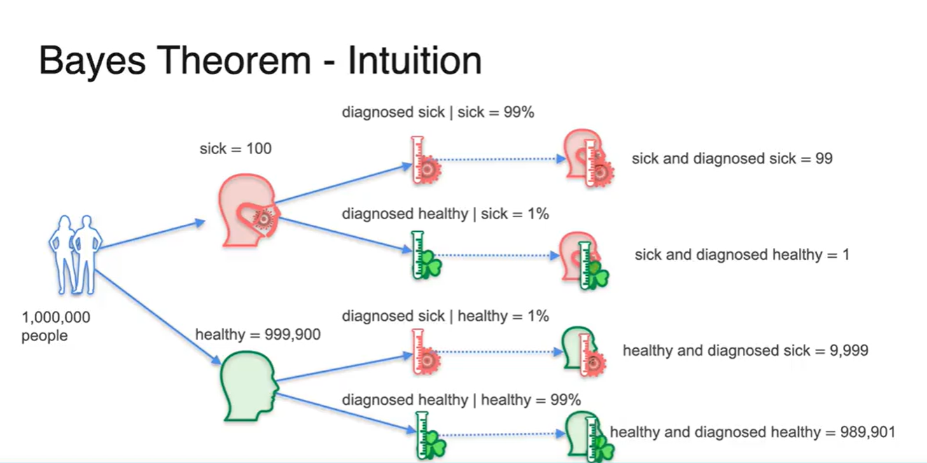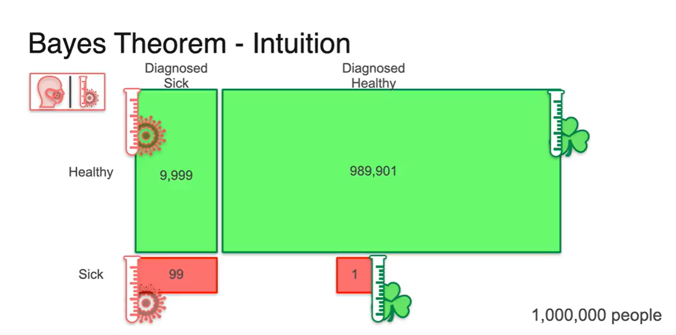 전체 사람이 1,000,000명이라면 999,900명의 건강한 사람이 건강하다고 진단받고, 100명의 사람이 병이 있는 것으로 진단 받는다.