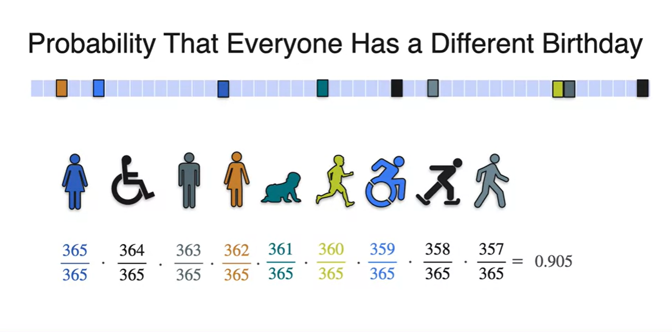 이런 식으로 모든 사건을 곱하면, 9명의 사람이 있을 때 모든 사람의 생일이 다 다를 확률이 0.9로 계산되어 나온다.