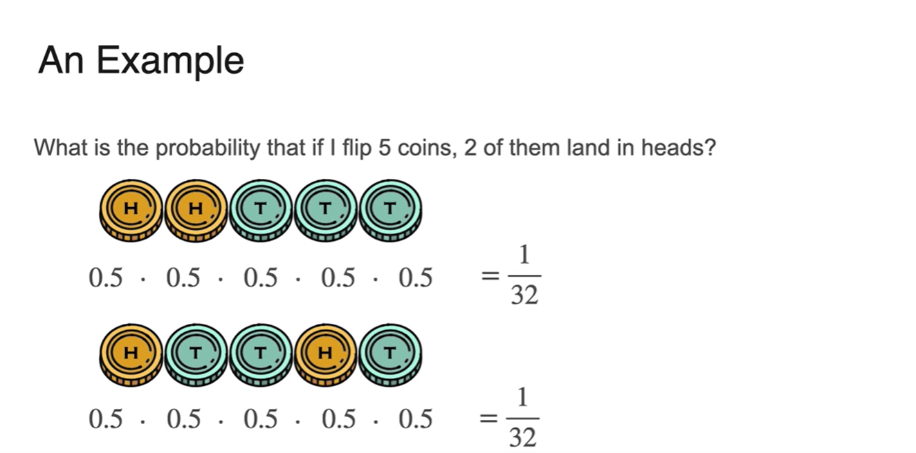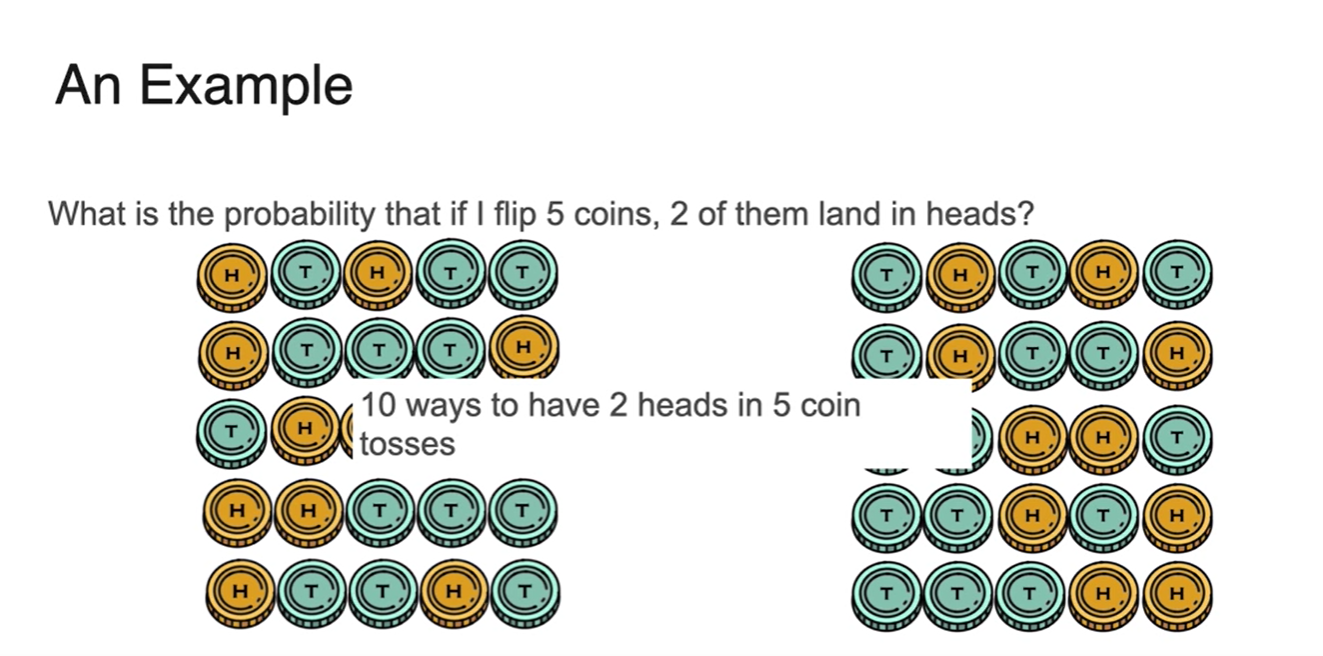5번의 동전 던지기를 통해 2번의 head를 얻을 수 있는 확률은 얼마인가?