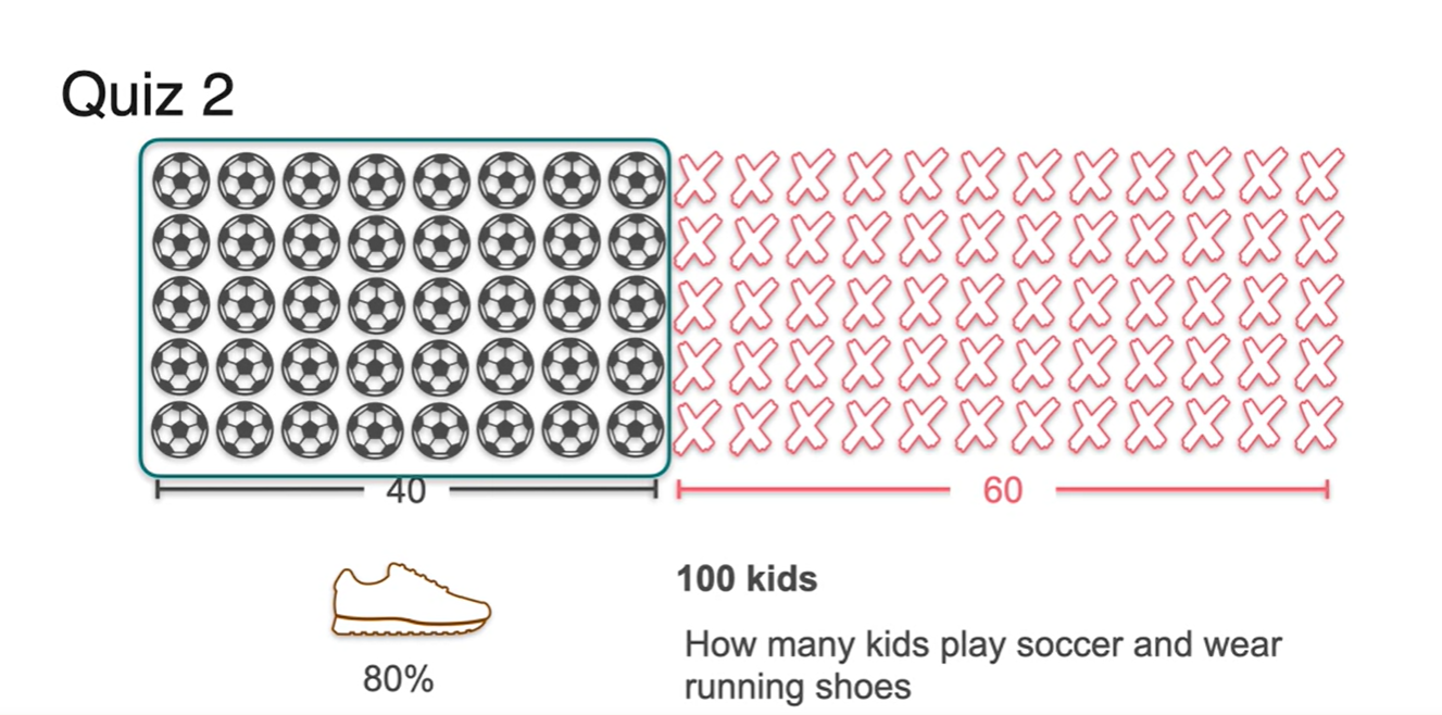 이번에는 100명중 40명의 친구들이 축구를 할 줄 아는 상황이 주어진다고 가정해보자.