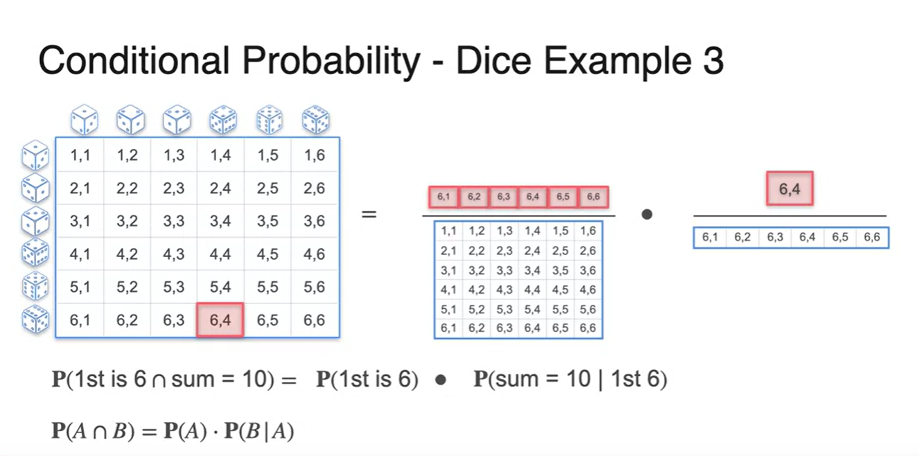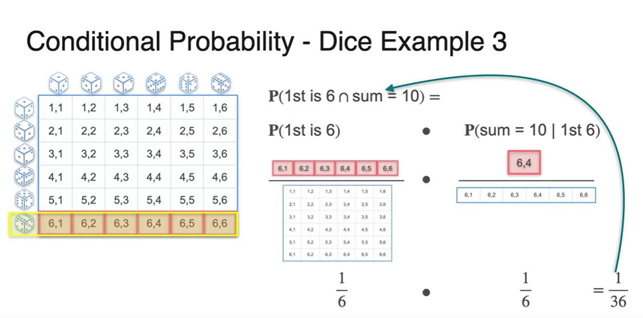 두 번째 사건은 첫 시행이 6이 나올 확률 중에서 합이 10인 확률이므로 이다.