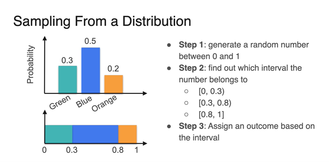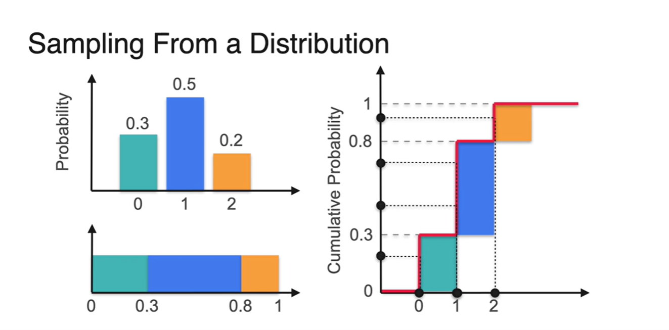 Generate한 값이 [0, 0.3), [0.3, 0.8), [0,8, 1) 세 구간 중 어느 구간에 속하는지 알아낸다.