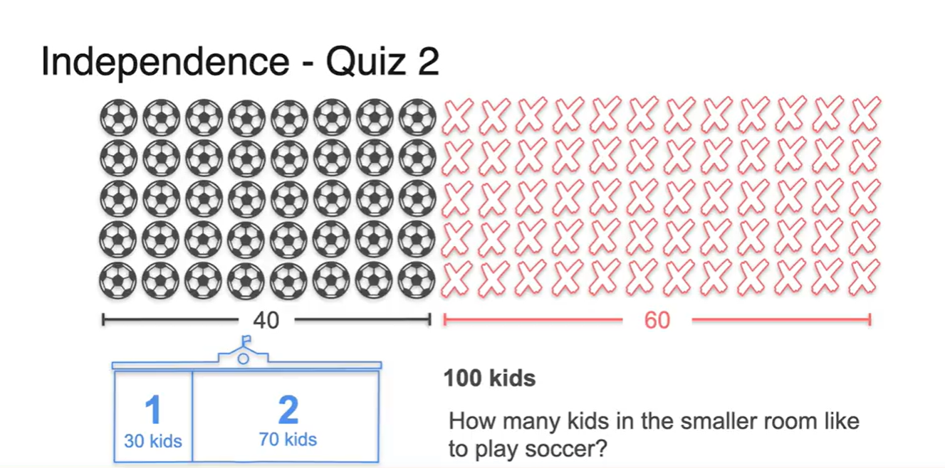 전체 확률인 100명중 40명이 축구를 했다는 정보와 100명 중 30명이 1반이라는 정보는 사실 서로 독립된 사건이다.