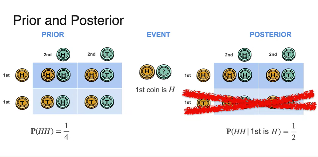 모든 경우의 수를 표로 정리한다면 아래 표와 같고, 첫 시행의 결과가 head라는 사실을 나타내면,