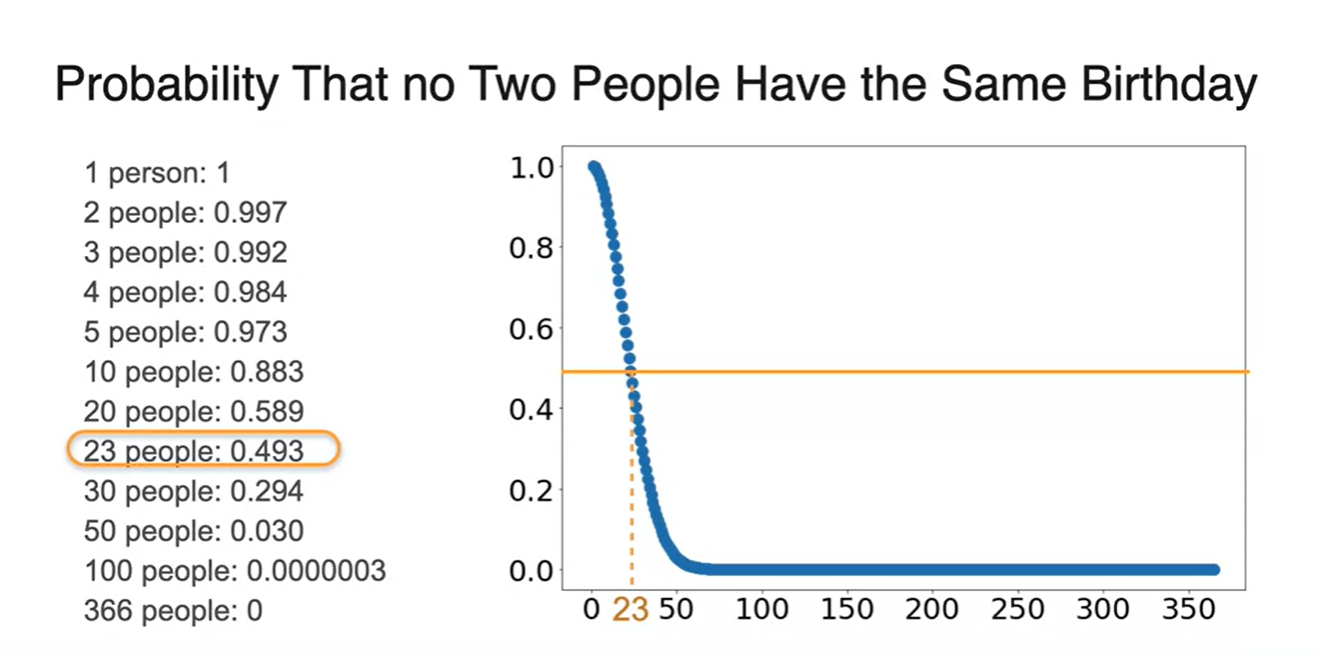 재미있는 점은 23명의 사람의 모였을 때, 0.5의 확률로(반반) 두 사람의 생일이 같을 수 있다는 점이다.