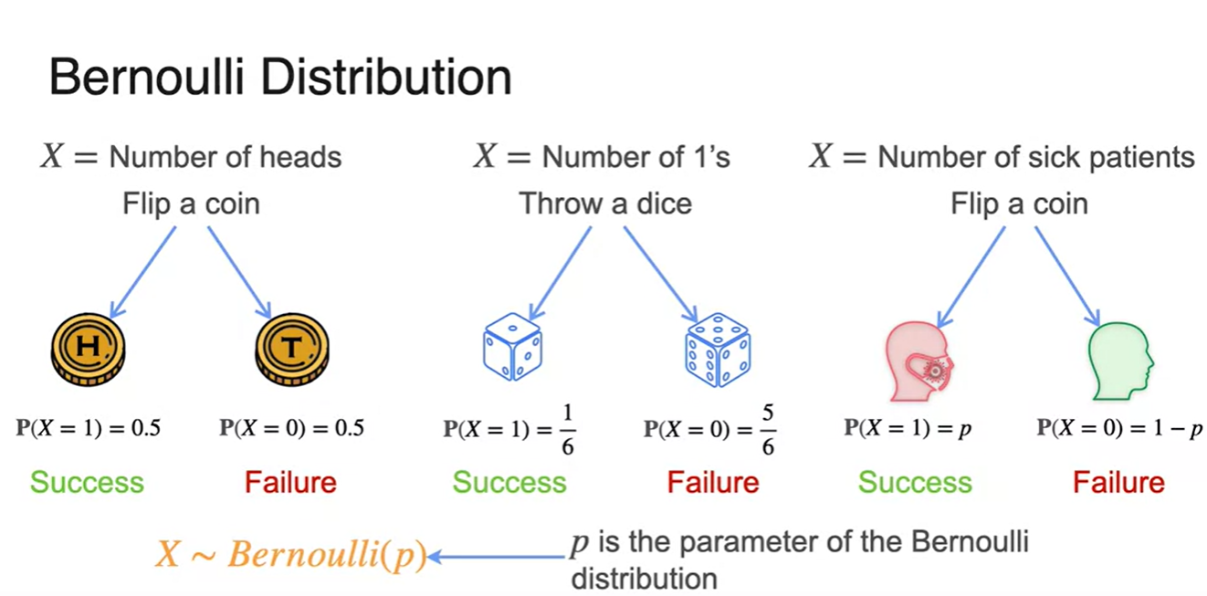 Bernoulli Distribution은 한 번의 시행에서 얻어낼 수 있는 success와 failure의 확률을 나타낸다.