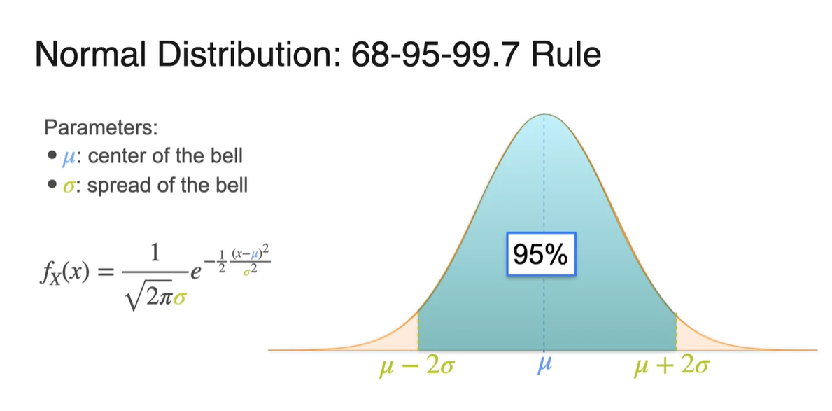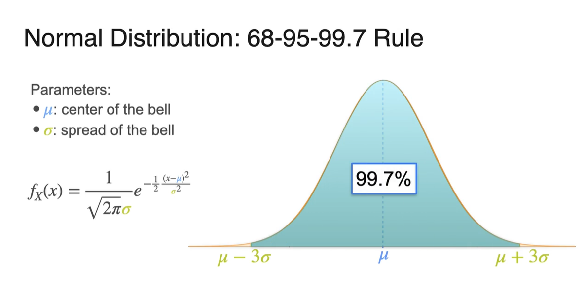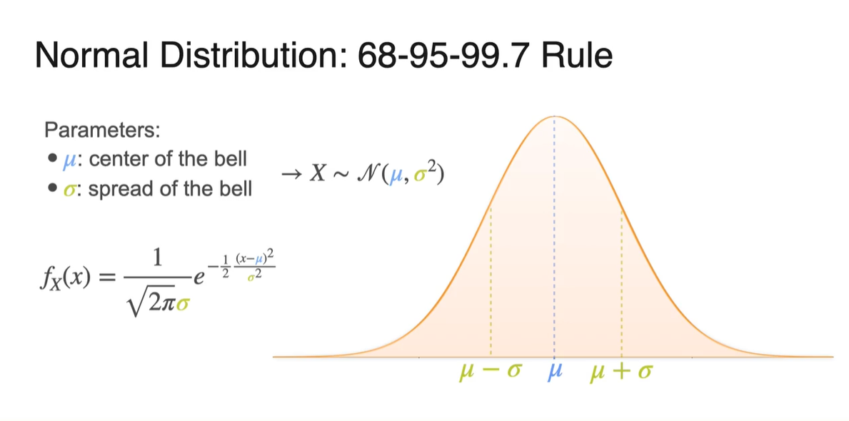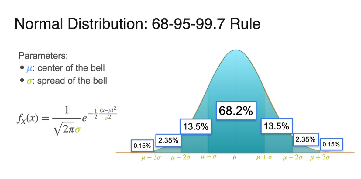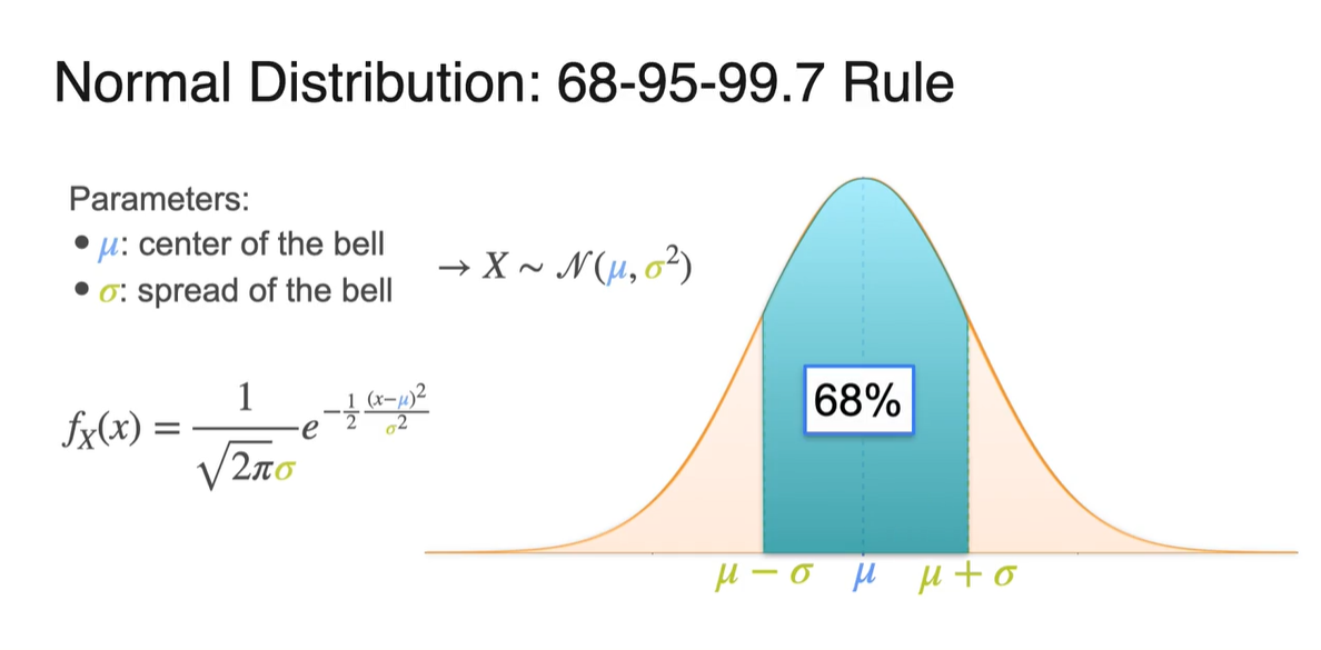 확률 변수 가 와 사이를 가질 때의 면적은 전체 면적의 68%를 차지한다.