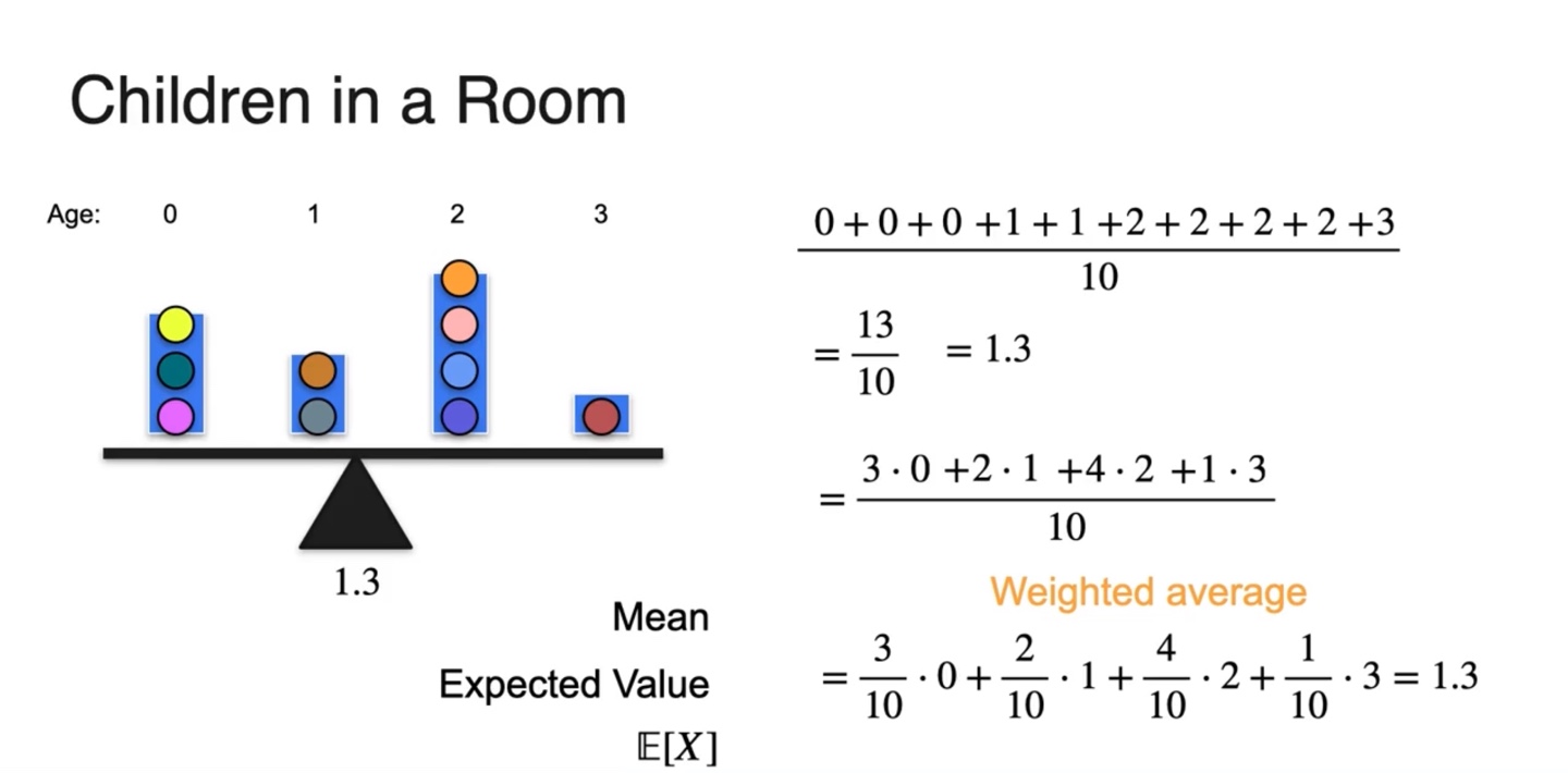 전체 개수의 비율 즉, {확률 * 확률 변수(Random variable)}로 표현되며, weighted average가 평균의 정의이다.
