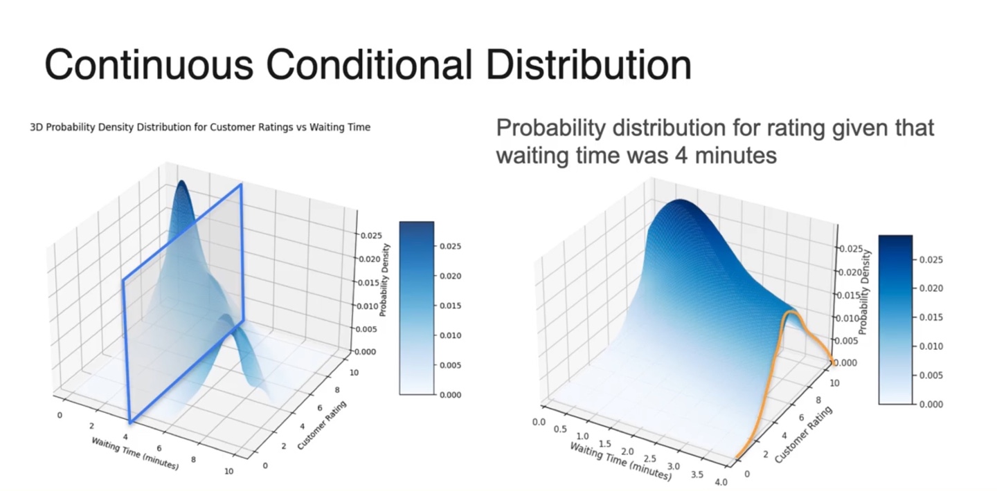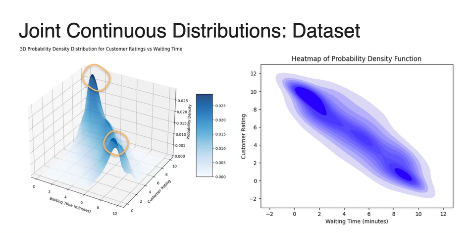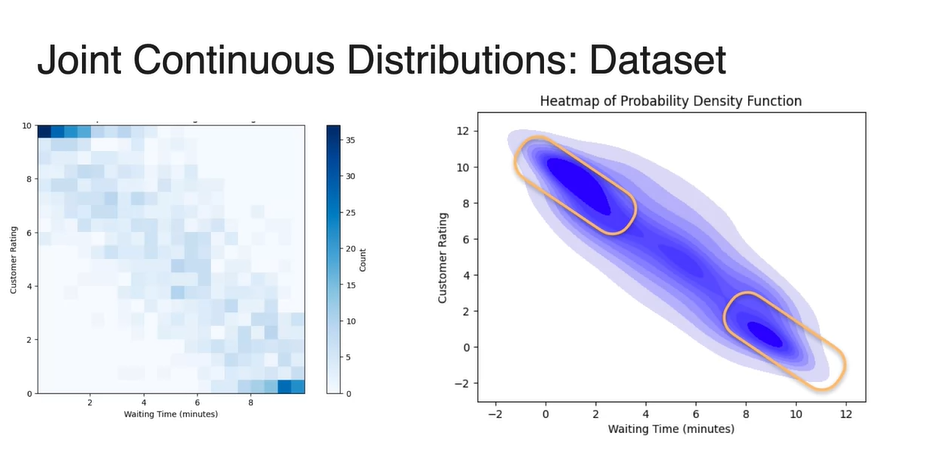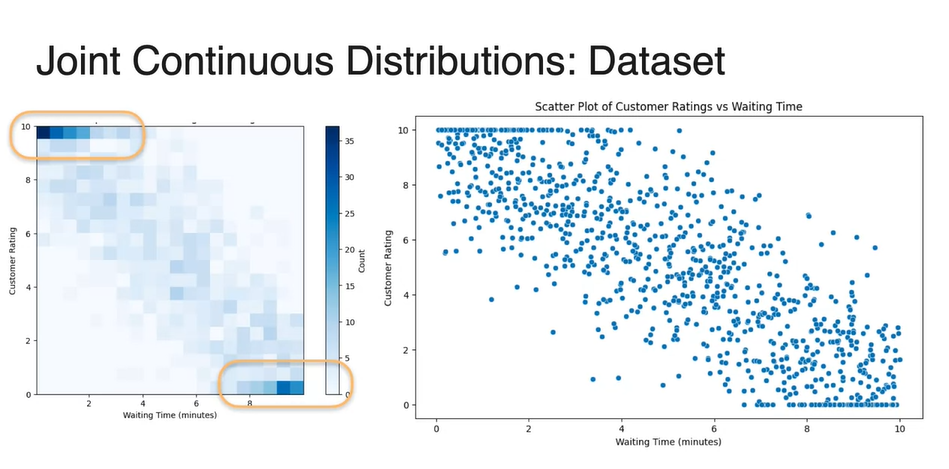 - Continuous joint distributions are typically represented by scatter plots, while discrete joint distributions are represented by bar charts.