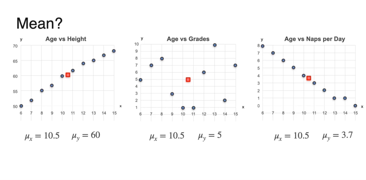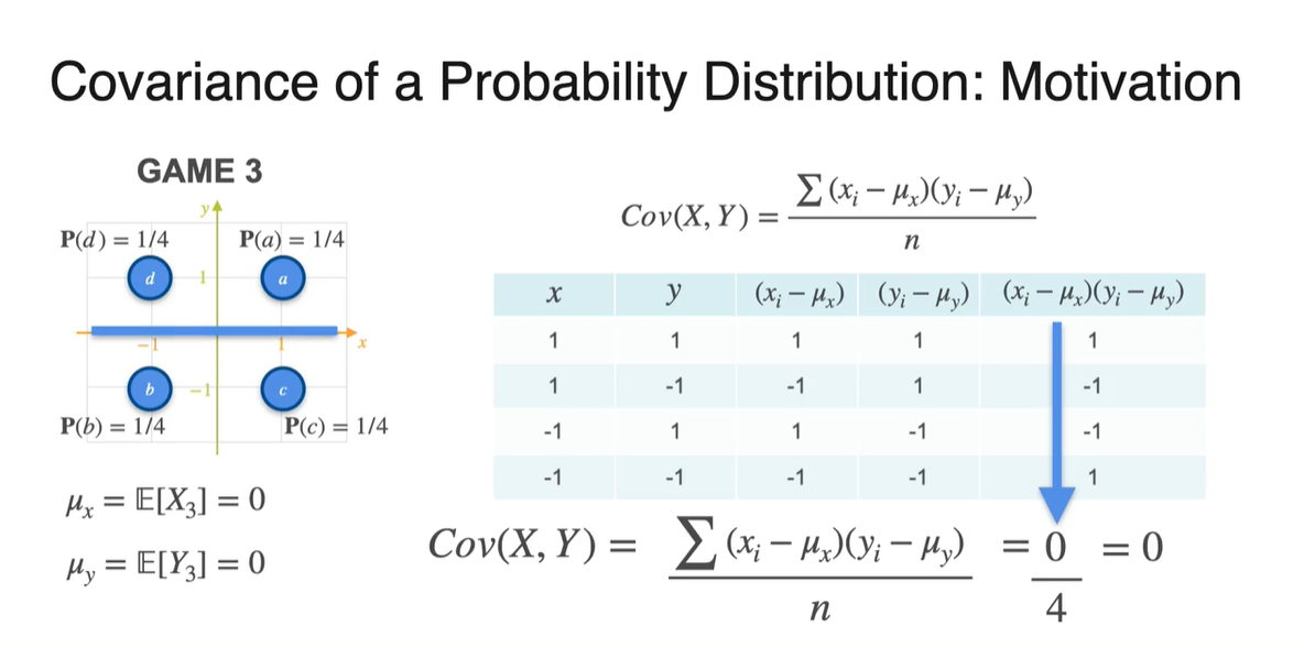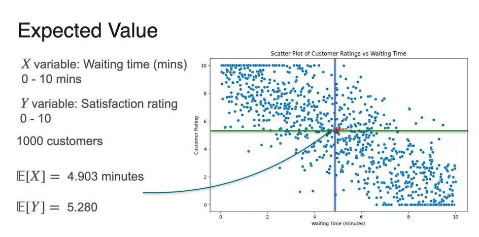 Expected Value 즉, 두 확률 변수의 독립적인 기댓값은 scatter plot의 각 축을 기준으로 각각 평균내어 구할 수 있다.