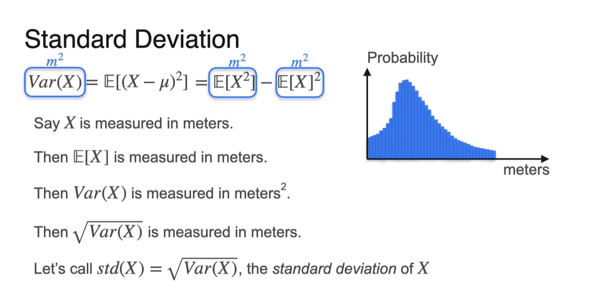 만약 한 class의 학생들의 키를 측정하여 확률 분포를 표현하면, Variance의 단위는 meter 제곱()이 된다.