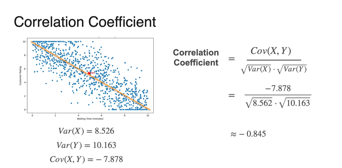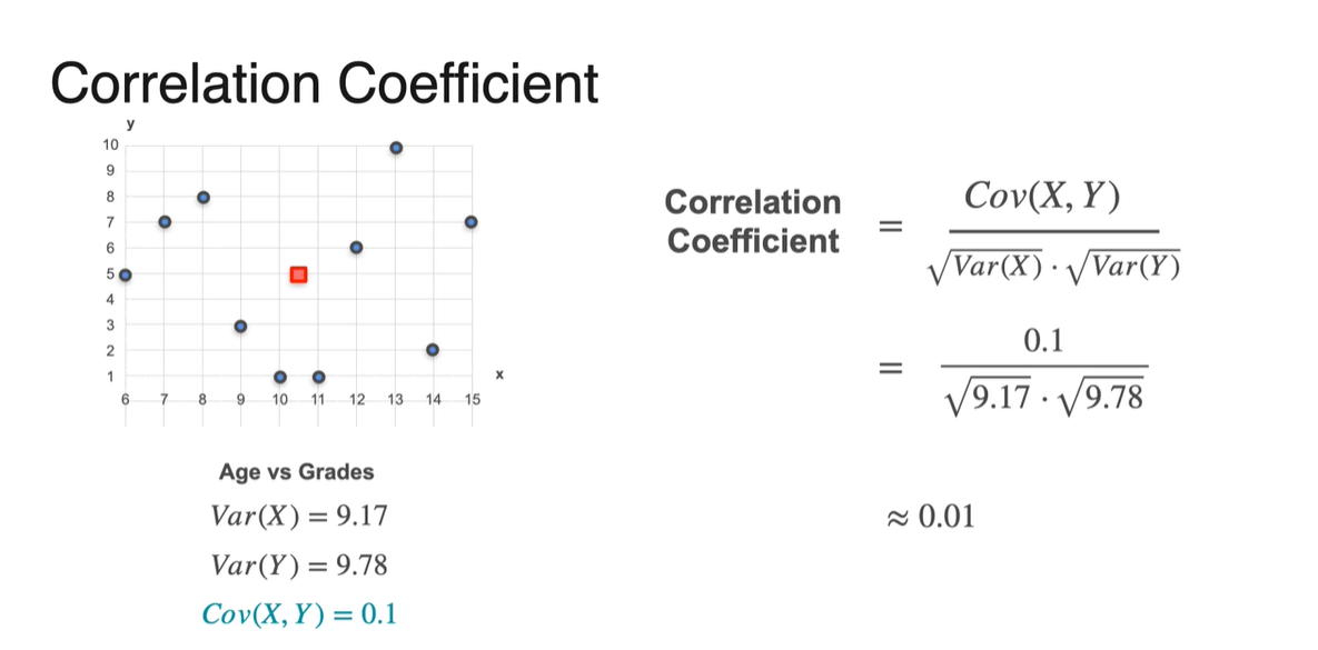 Covariance가 0.1이었던 예제의 Correlation Coefficient는 0.01로 변환되었다.