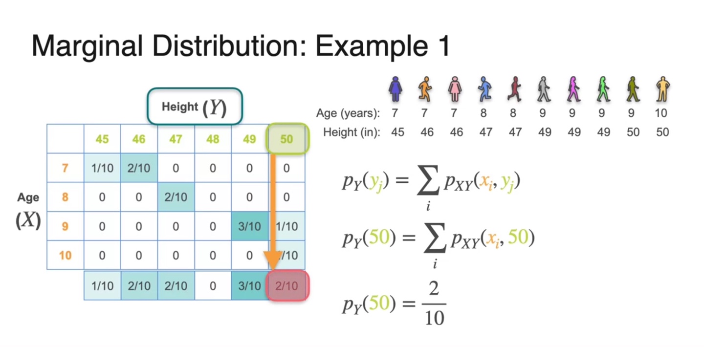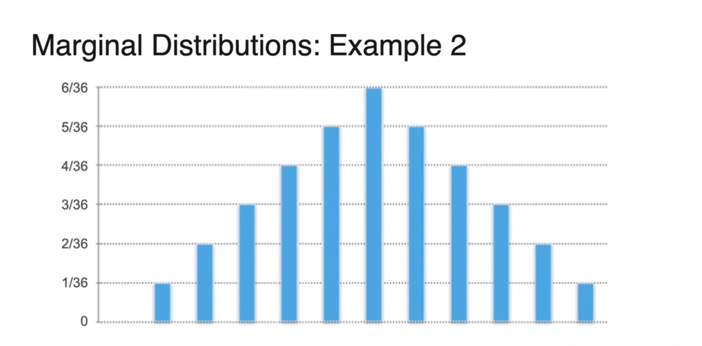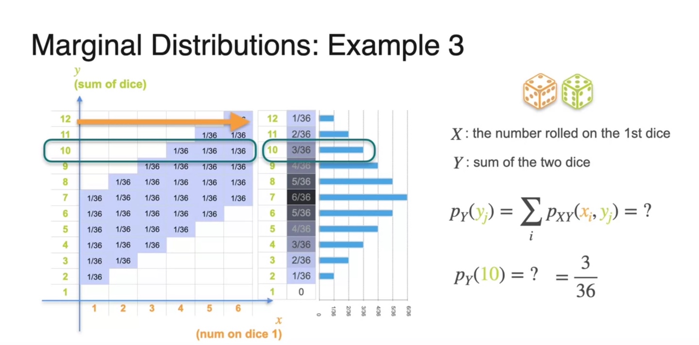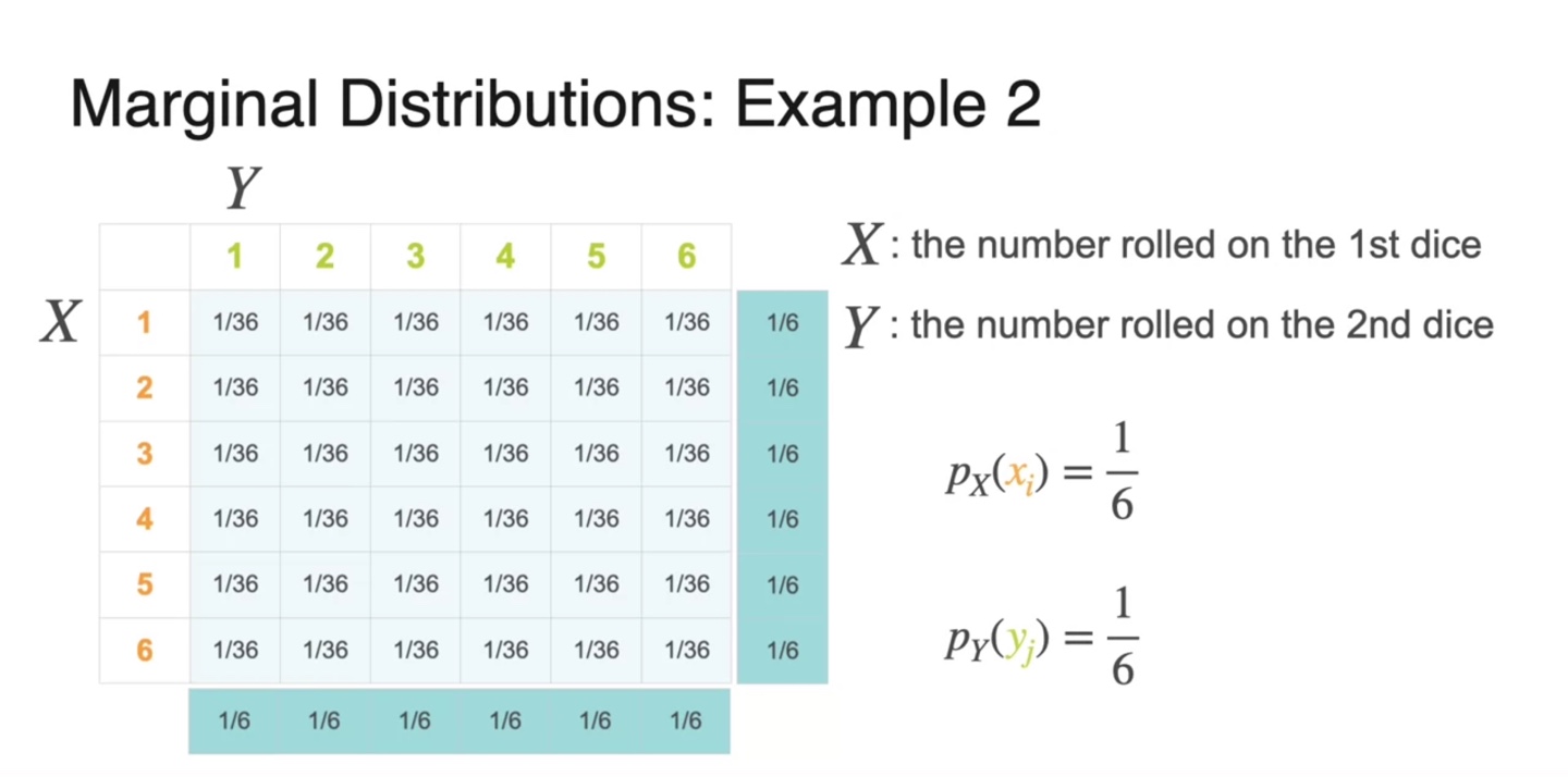확률 변수 의 Marginal distribution은 기존 Joint distribution을 y축 기준으로 projection 내려 구해지는 모든 probabilities를 합한 값이다.