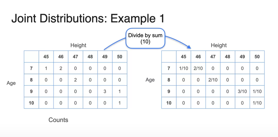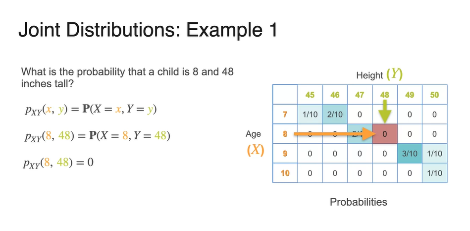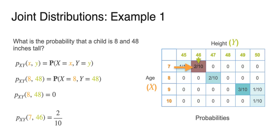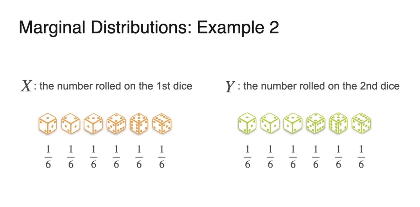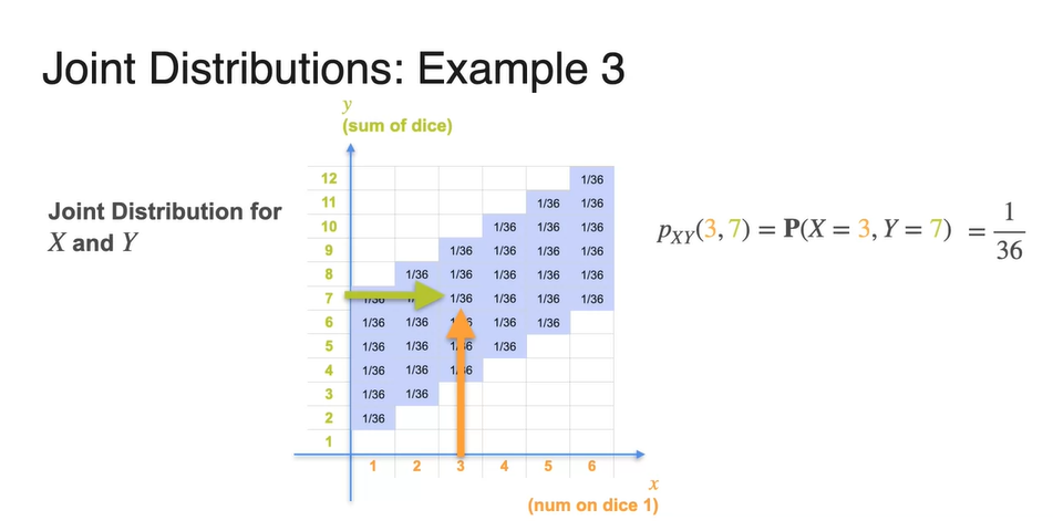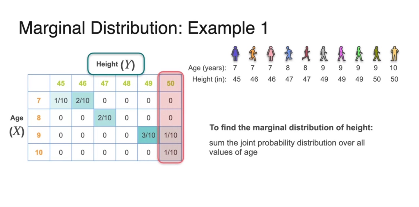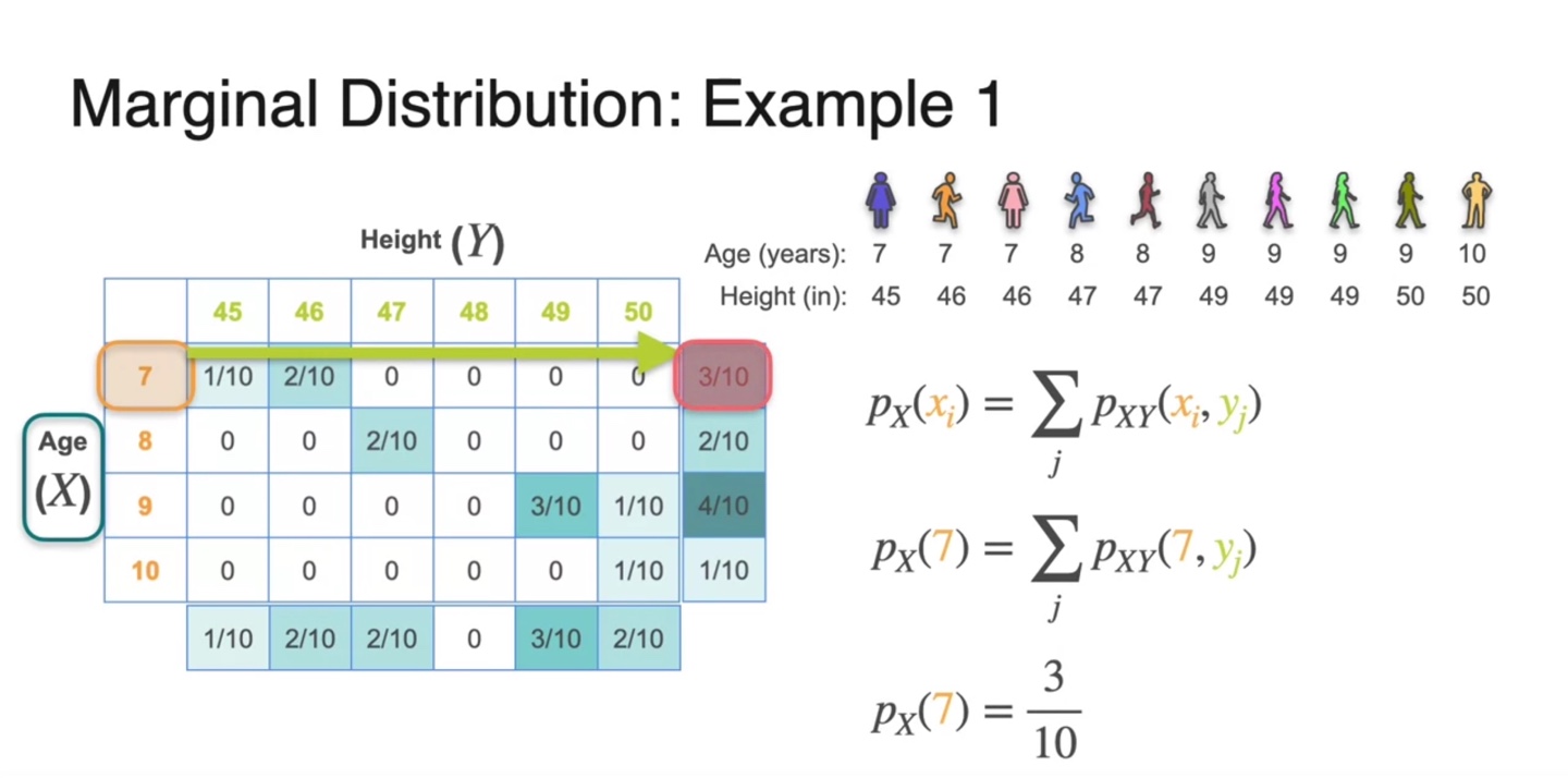 확률 변수 의 Marginal distribution은 기존 Joint distribution을 y축 기준으로 projection 내려 구해지는 모든 probabilities를 합한 값이다.