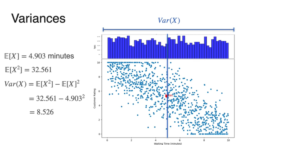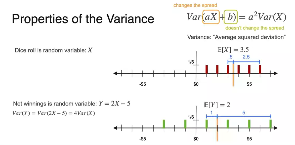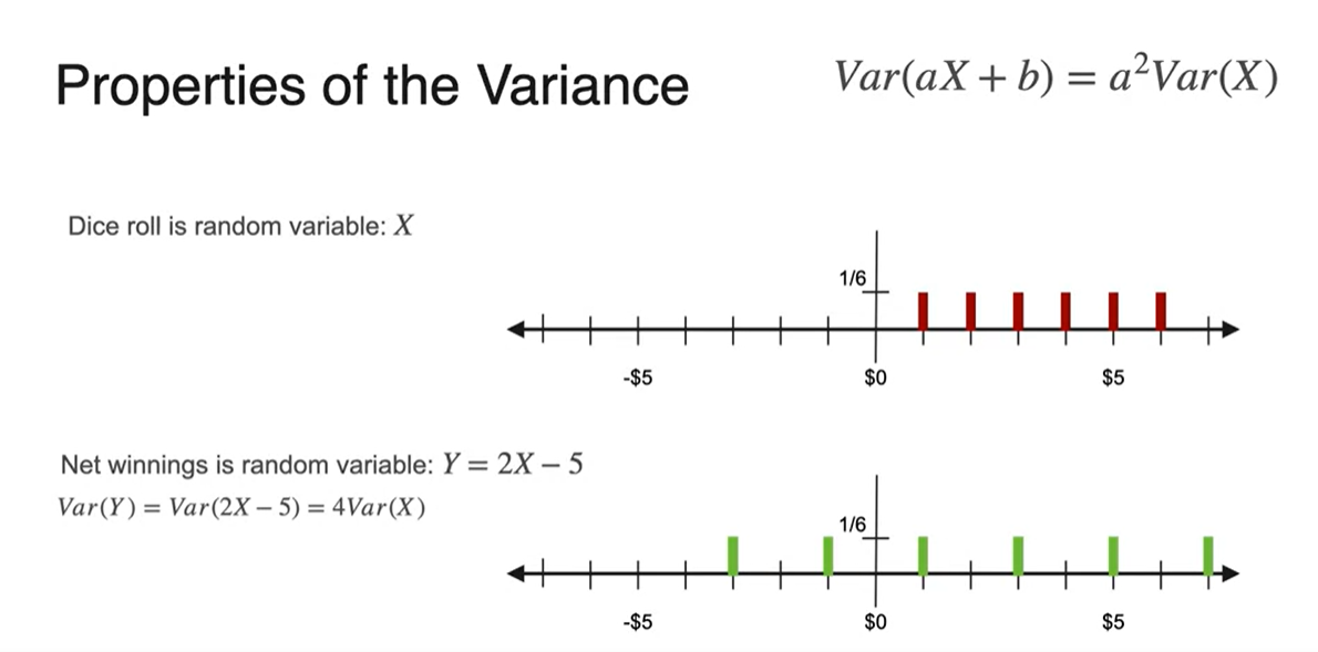 평균으로부터의 거리를 구해보면 기존 분포에서의 편차는 0.5, 2.5인 반면 의 분포는 1, 5로 딱 2배씩 증가했음을 알 수 있다.