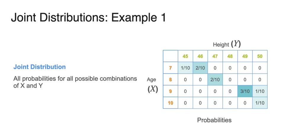 만일 학생들의 나이(age)를 확률 변수 로, 키(height)를 , 성적(grades)을 라 하자.