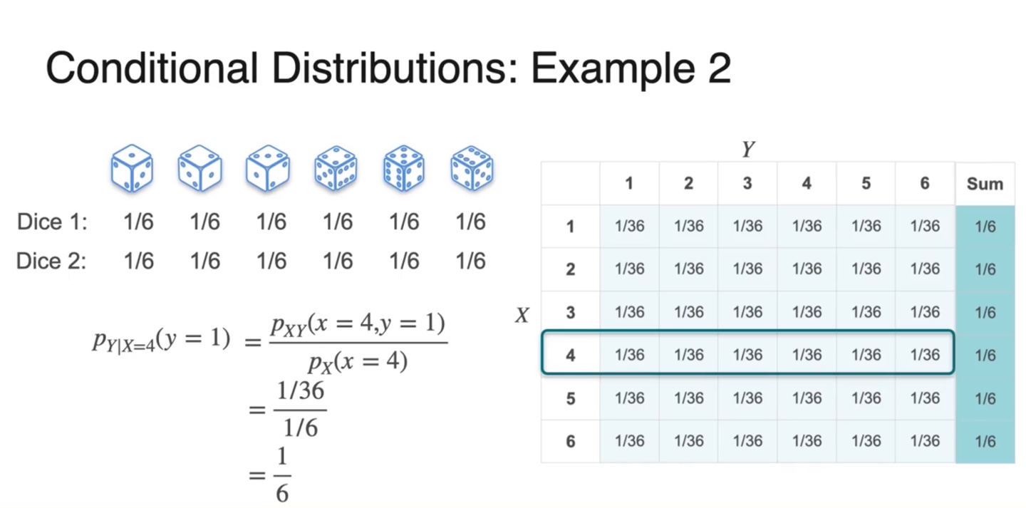 두 주사위의 number를 확률 변수로 갖는 예제에서 Conditional distribution을 구해보자.