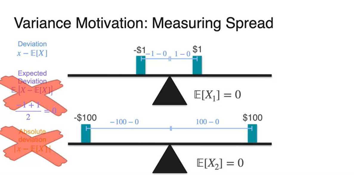 편차의 평균을 내면 양수 음수의 값이 서로 상쇄되기 때문에 spread를 측정하기에 알맞지 않다.