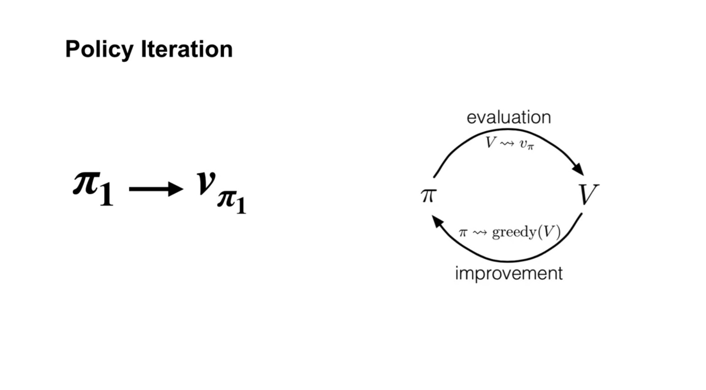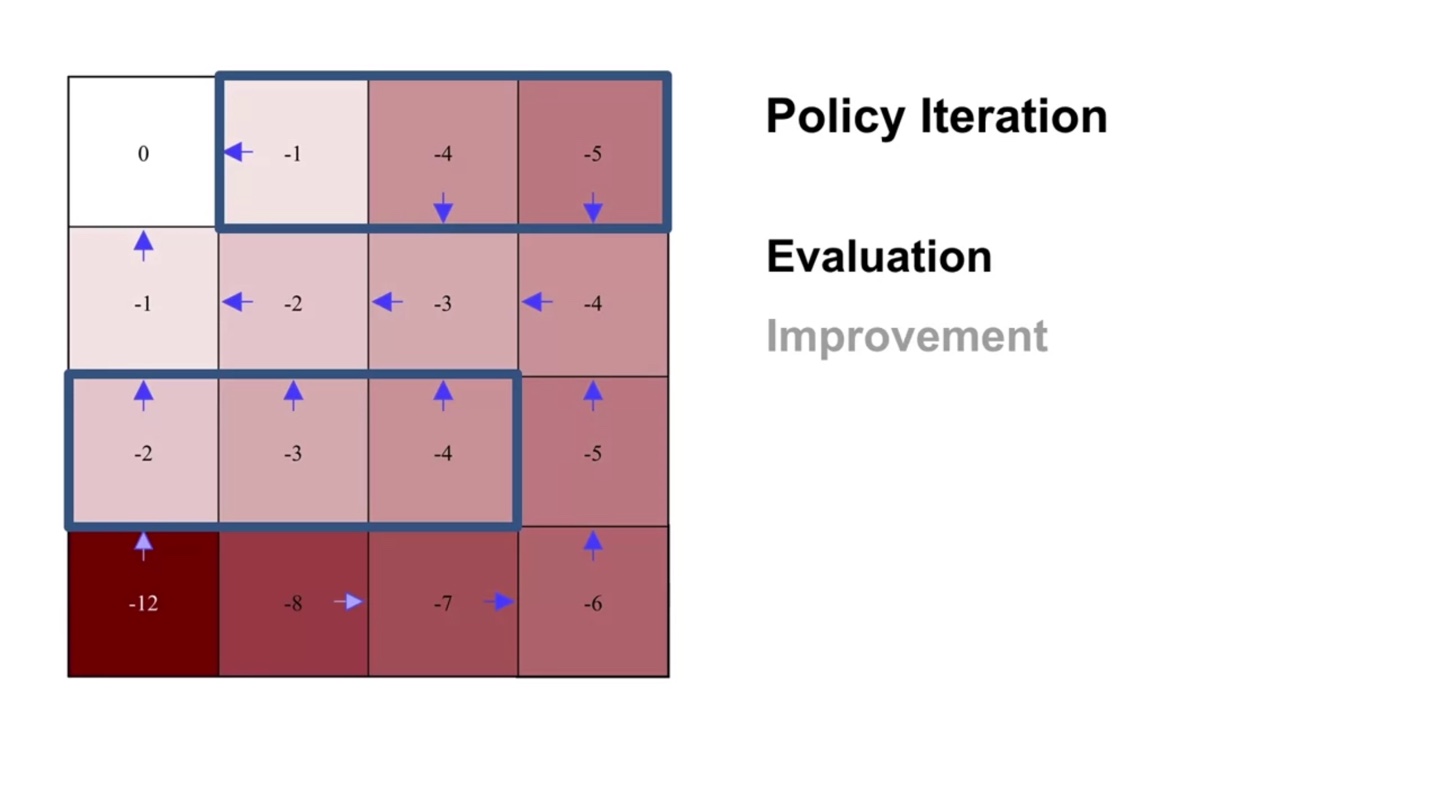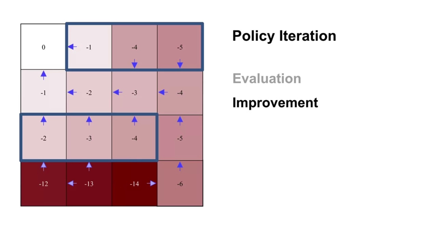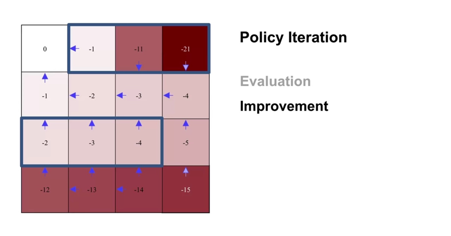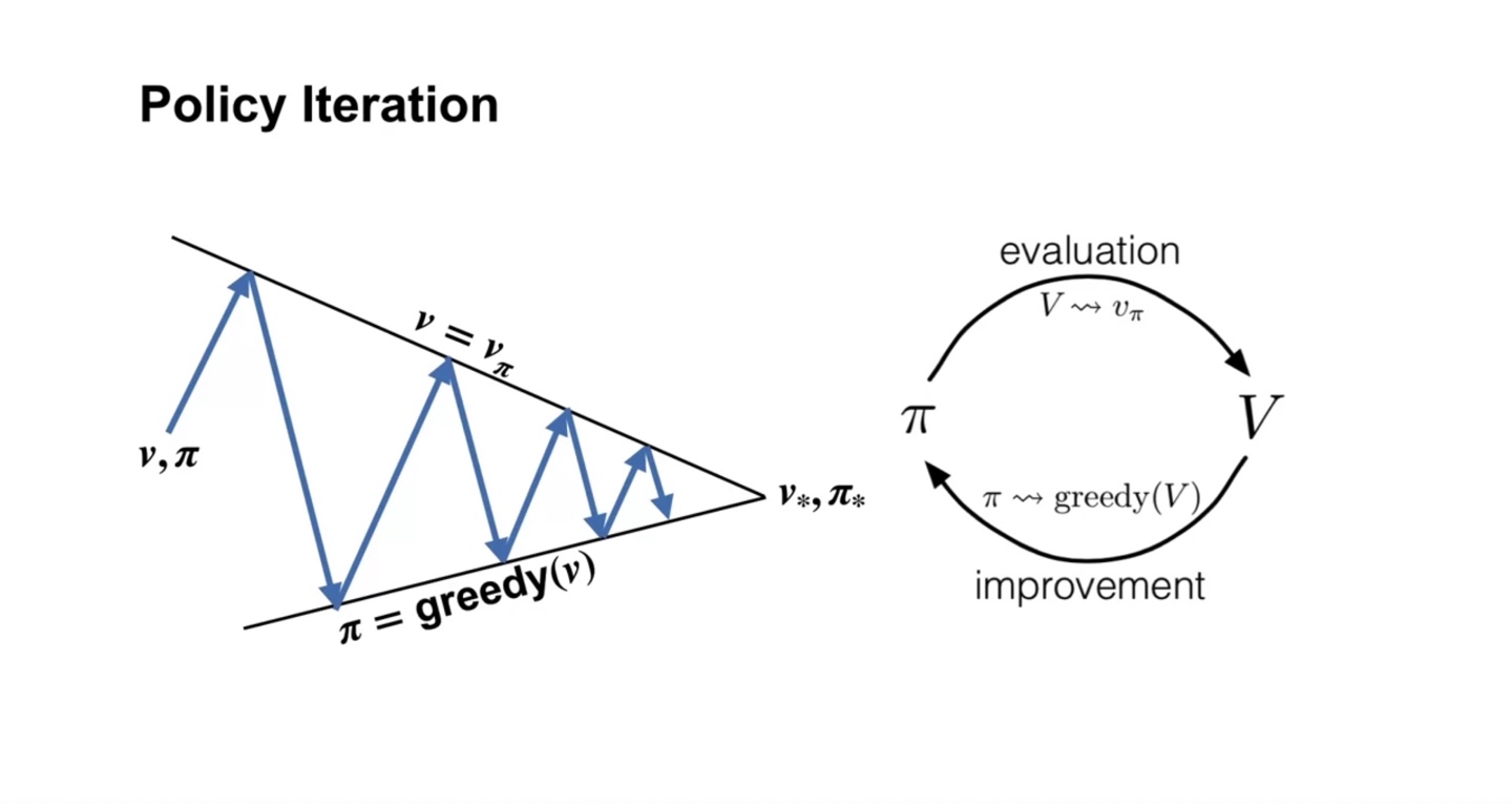 Policy Iteration은 아래와 같은 일련의 과정으로 evaluation과 improvement가 반복된다.