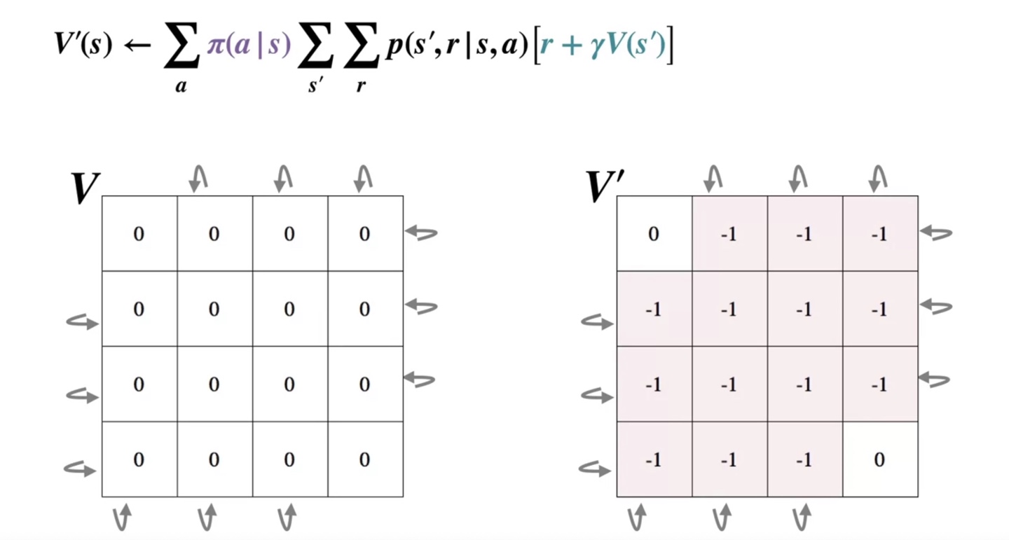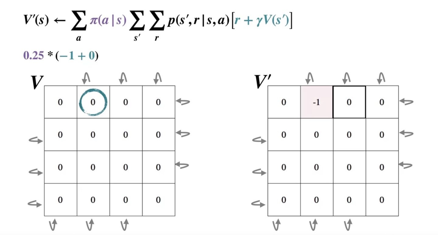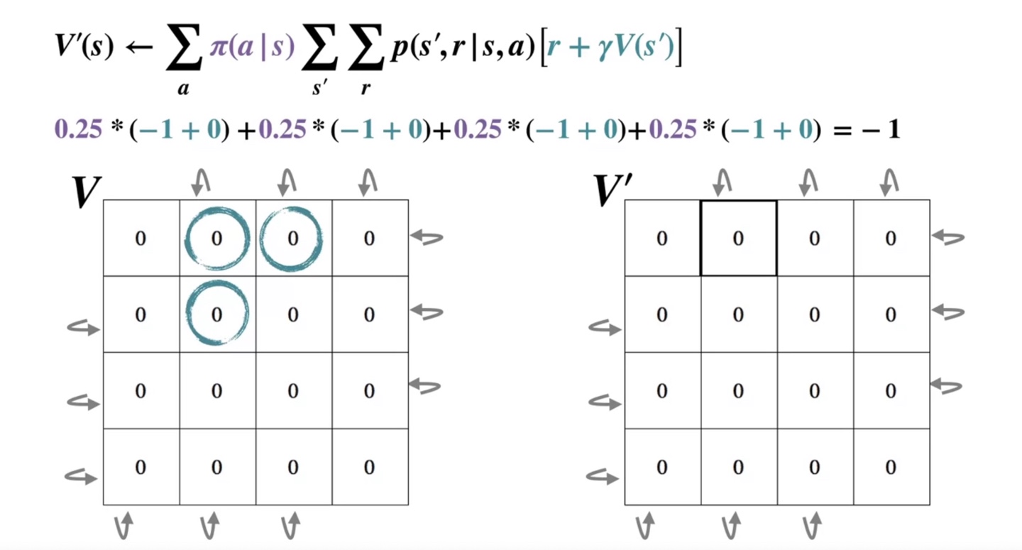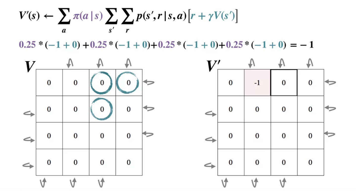 위로 가는 경우의 수는 다시 현재 상태로 돌아오고 오른쪽, 아래 state의 value까지 모두 계산한 값을 더하면 -1로 얻어진다.
