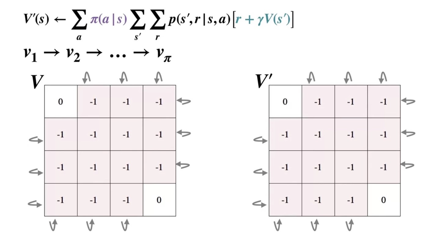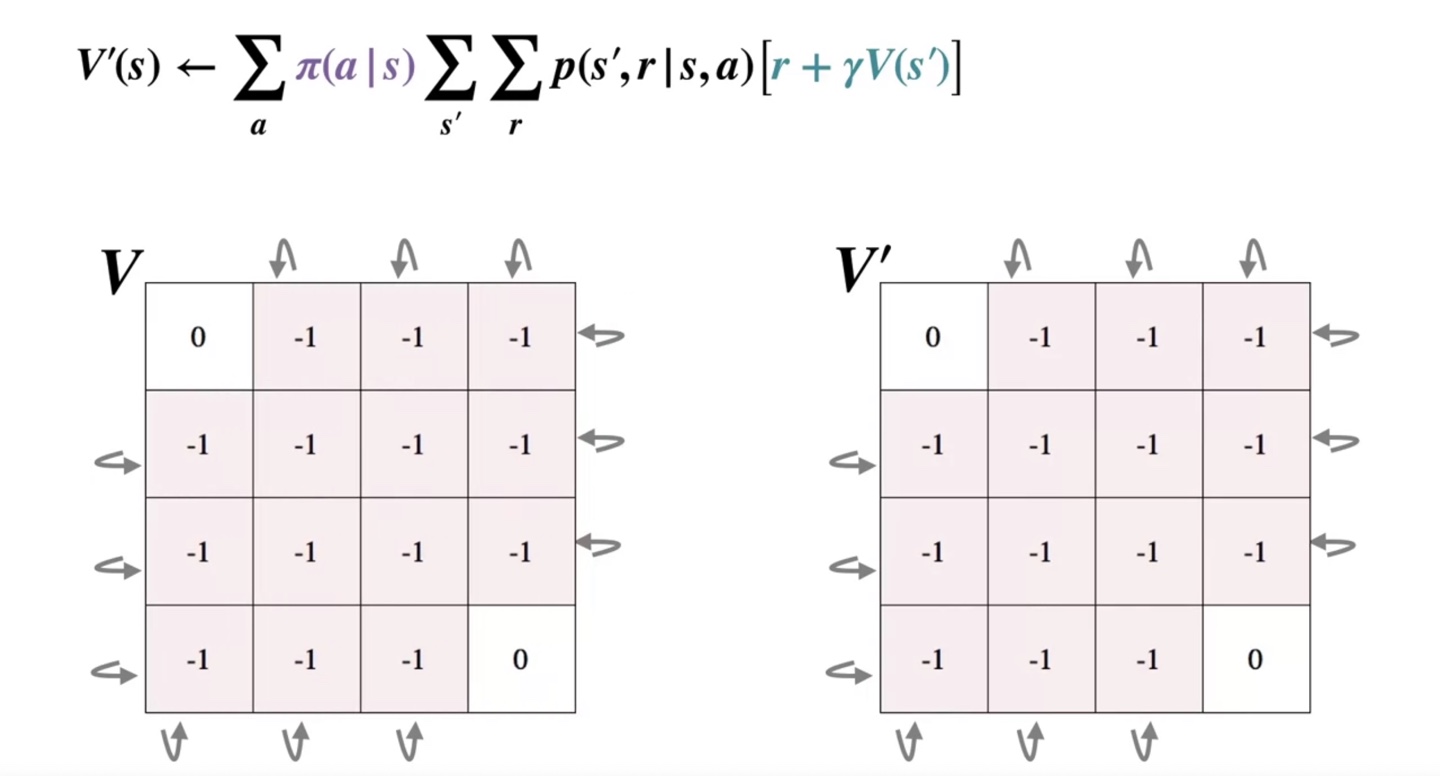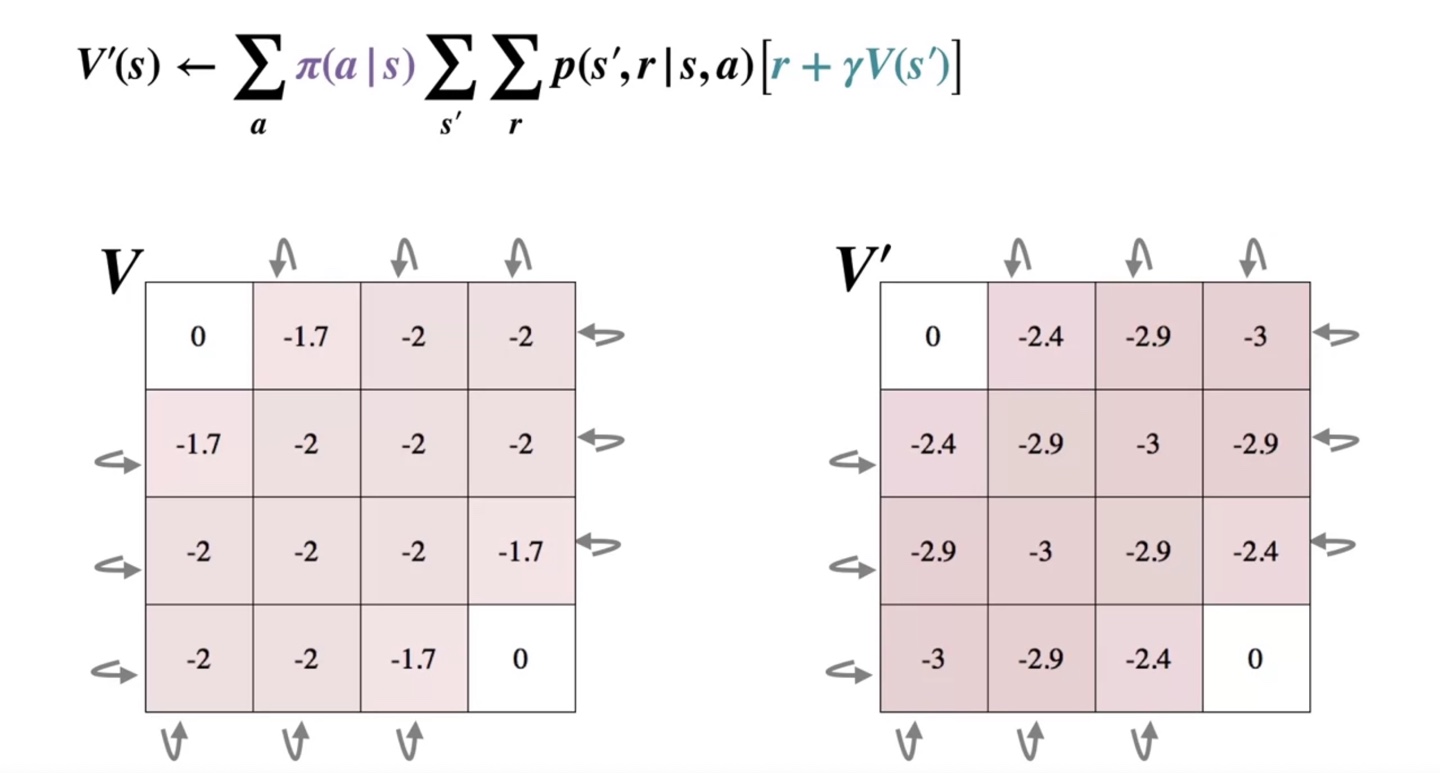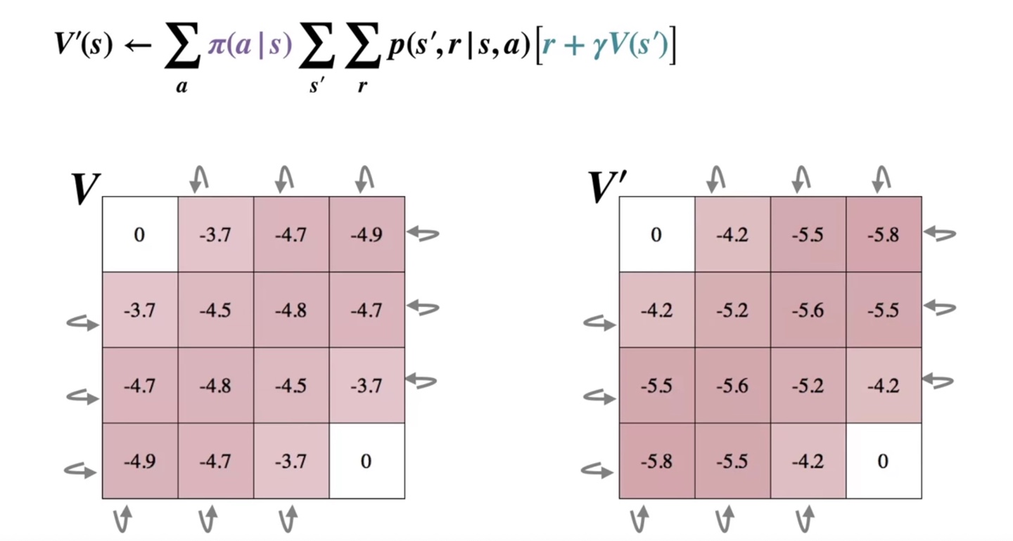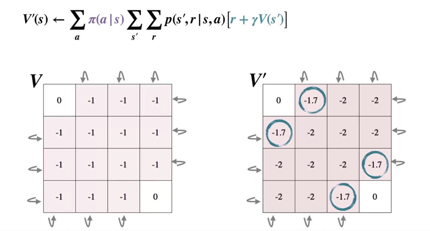 위로 가는 경우의 수는 다시 현재 상태로 돌아오고 오른쪽, 아래 state의 value까지 모두 계산한 값을 더하면 -1로 얻어진다.