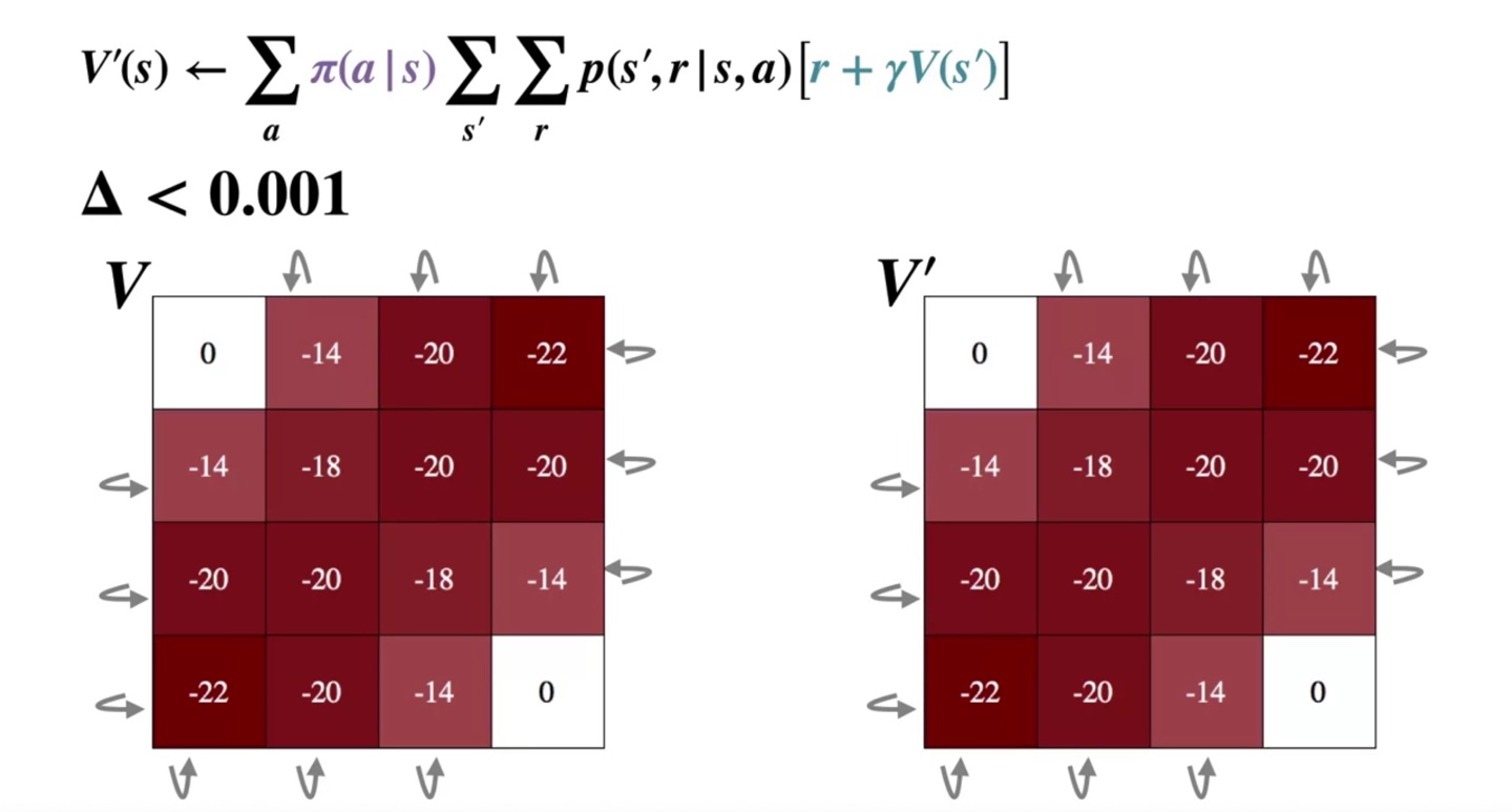 또 한 번의 evaluation sweep으로 value가 바뀌었고 이를 바탕으로 policy improvement한 결과, 어떠한 policy도 업데이트 되지 않았다.