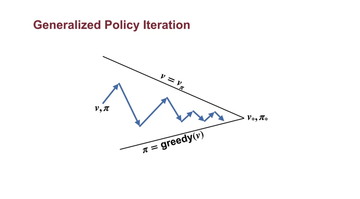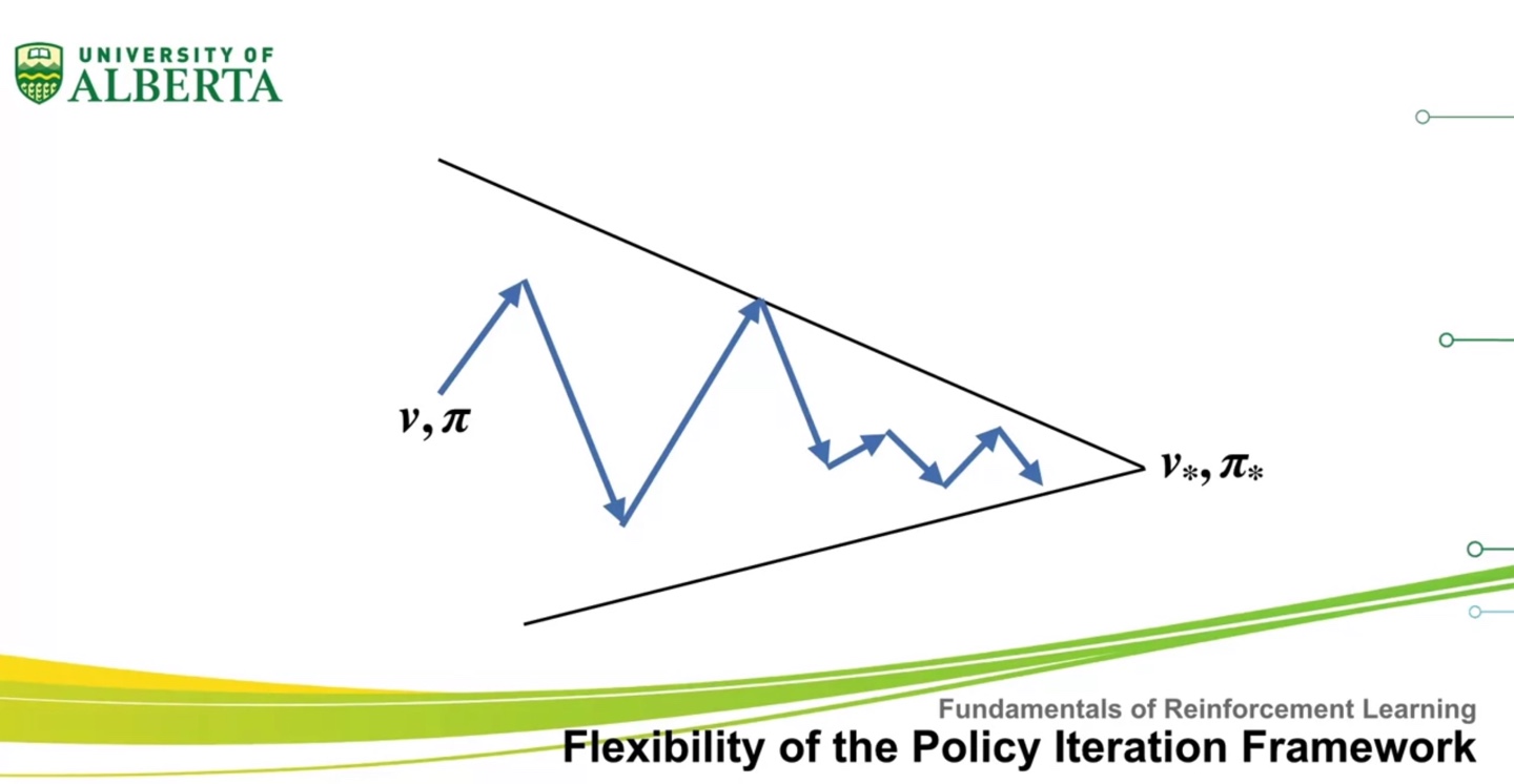 Generalized Policy Iteration은 아래와 같이 maximum value와 완전한 greedy 선택이 아니더라도, optimal value & policy로 수렴하는 내용을 담고 있다.