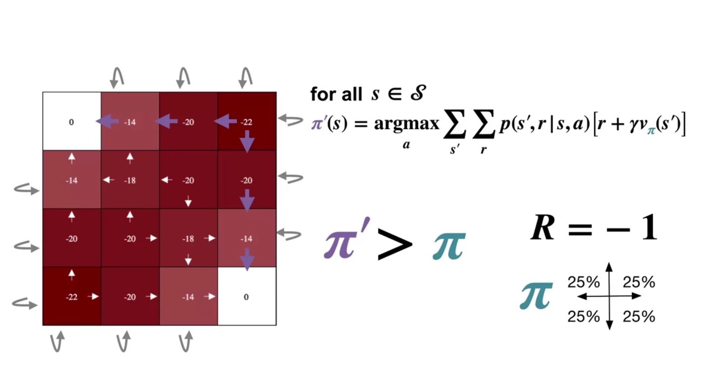Policy Evaluation과 policy improvement를 반복하며 policy를 향상시키다 보면 이전 policy에 비해 항상 더 큰 value를 가진다는 것을 알 수 있다.