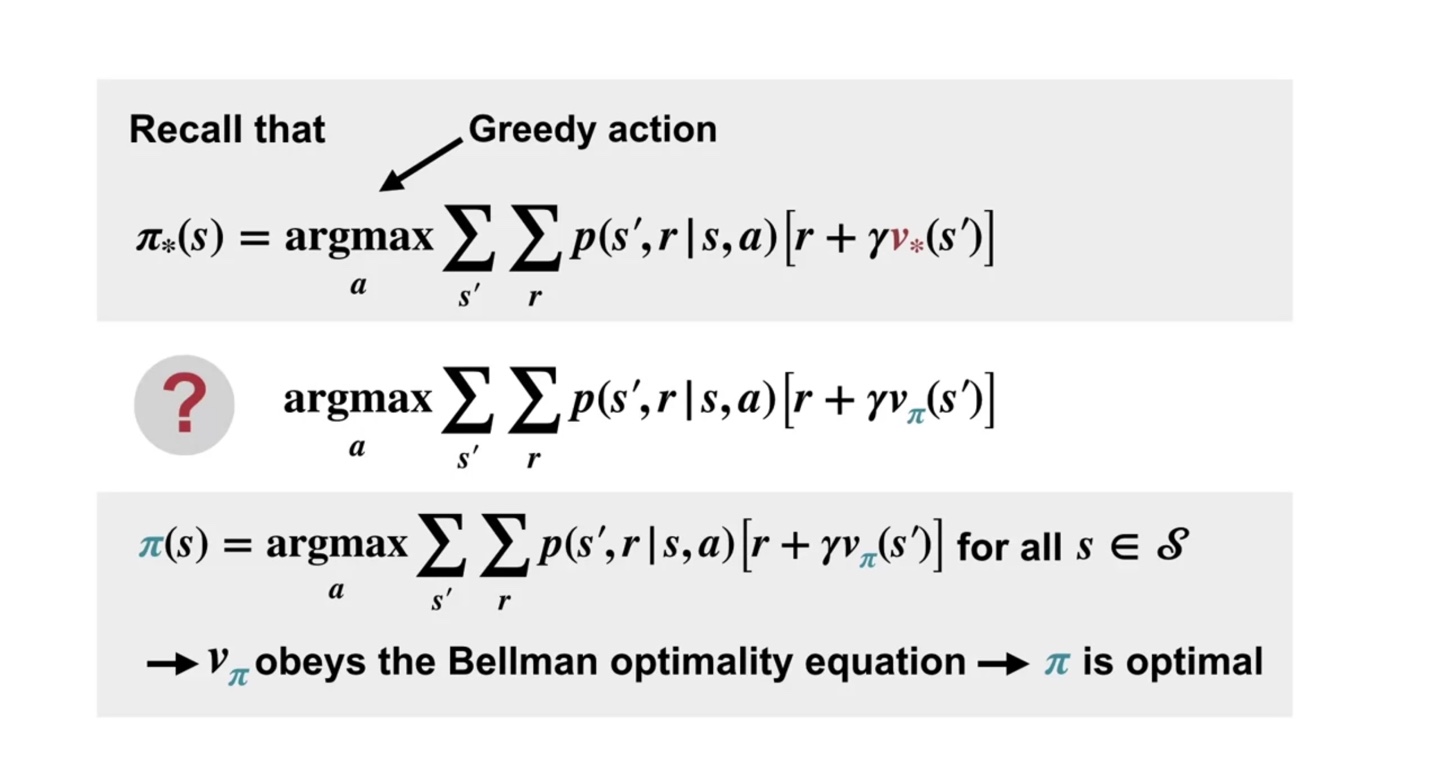 Optimal value 의 argmax 즉, greedy하게 value를 선택해 action을 취하면 optimal policy 를 따른다고 하였다.
