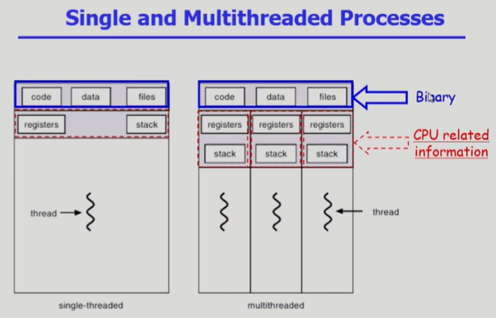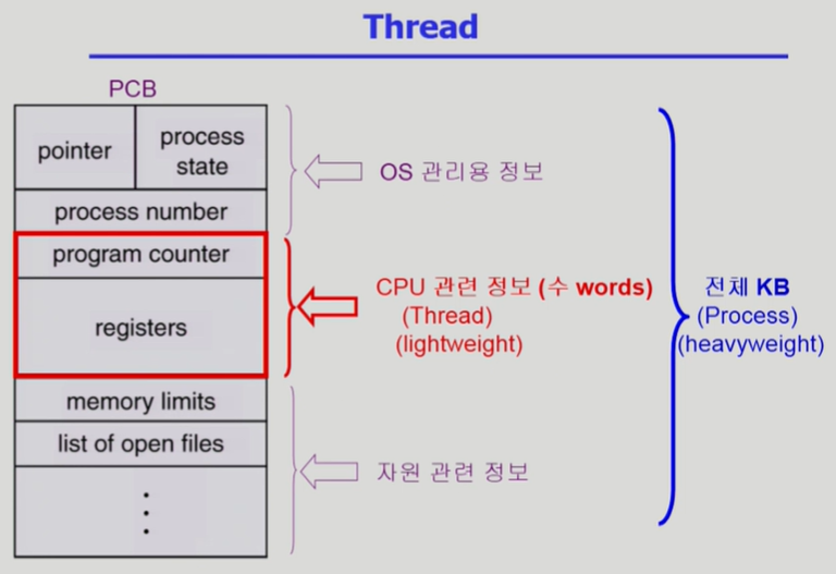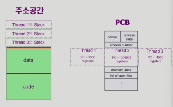 보통 Code-Data-Stack을 띄워놓고 실행하는데, 각 Thread마다 program counter가 가리키는 값을 나눠가진다.