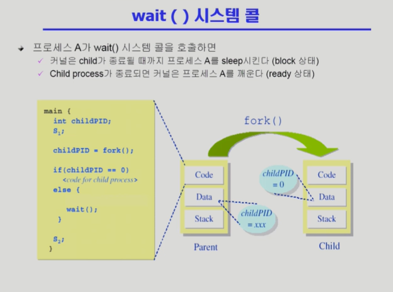 wait() 시스템 콜을 호출하면 block 상태로 만들어 ready하게 만든다.