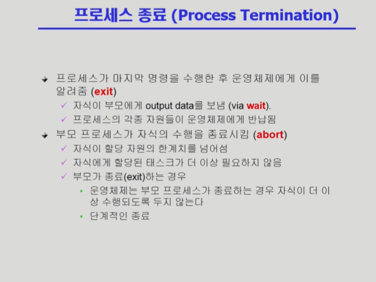 abort : 부모 프로세스가 자식의 수행을 종료시킨다.