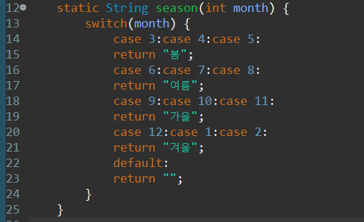 int 타입의 인자(월)을 입력받아 문자열(계절)로 반환하는 메서드를 작성했다. switch문을 메서드 안에 사용해보고 싶어서 if가 아닌 switch문을 썼는데...