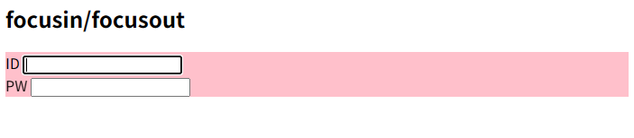 대상 요소에 있는 자식 요소가 포커스 되었을 때 focusin이 적용이 되고 대상의 자식 요소들이 모두 포커스를 잃었을 때 focusout이 적용된다.