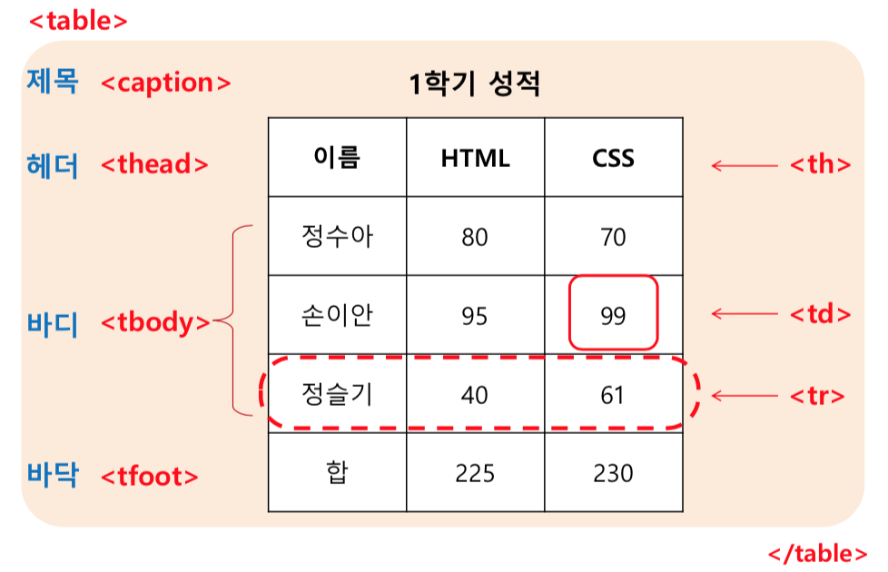 tr: 한 줄td: 한 칸tr … /trthtdthead, tbody, tfoottr 포함 가능