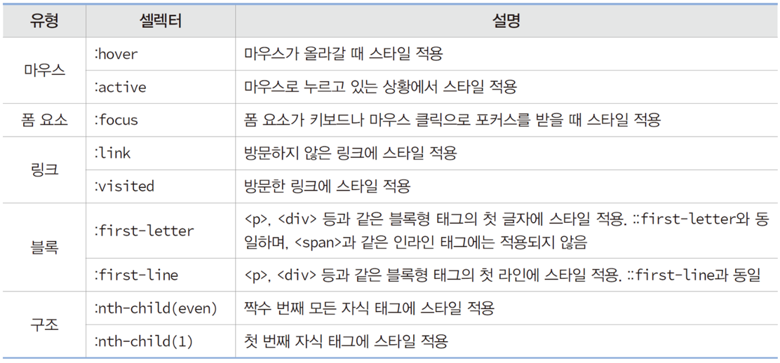 - 선택하고자 하는 HTML 요소의 특별한 ‘상태(state)’를 명시할 때 사용