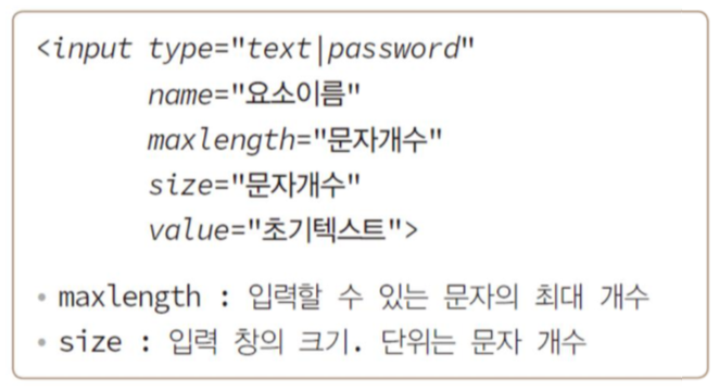 input type=”password” | 암호 입력을 위한 한 줄 텍스트 입력 창 |