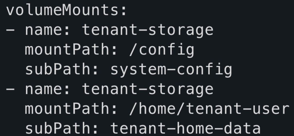 name: tenant-storagetenant-storage 라는 이름의 PVC를 찾아서 가져옴. 이전에 설정한 8Gi 짜리 디스크 공간을 가리킴mountPath/config : SSH 서버가 부팅될 때 필요한 호스트 키, 설정 파일들을 읽어가는 장소/home/tenant-user : 테넌트가 접속하자마자 마주하는 홈 디렉토리subPathsystem-config, tenant-home-data 라는 별도의 디렉토리를 자동 생성하여 관리system-config : PVC 내부에 system-config 라는 폴더를 만들어 SSH 시스템 파일만 따로 모음tenant-home-data : PVC 내부에 tenant-home-data 폴더를 만들어 유저가 생성한 폴더나 파일들만 따로 모음subPath 없이 마운트하면 볼륨의 루트(Root)가 해당 경로를 완전히 덮어씌우는 상황 발생.subPath 기능을 통해 시스템 설정 파일과 사용자 데이터를 물리적으로 분리 & 관리포인트(PVC)는 하나로 유지tenant-storagesystem-configtenant-home-dataBeforeAfter