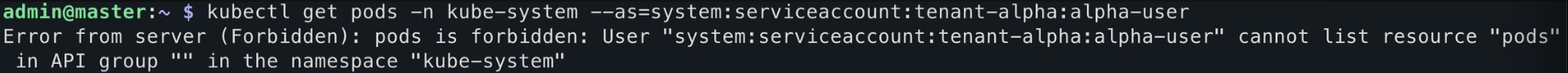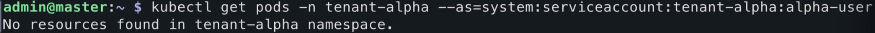 kubectl get pods -n tenant-alpha --as=system:serviceaccount:tenant-alpha:alpha-user