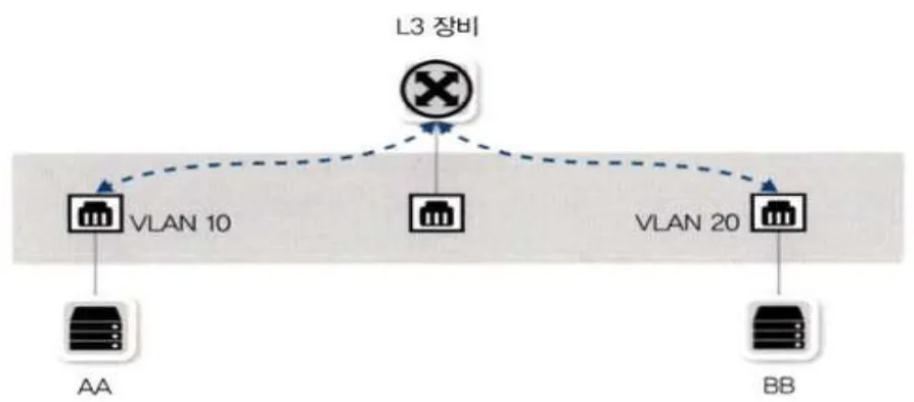- VLAN 간의 통신이 필요하다면 서로 다른 네트워크 간의 통신이므로 3계층 장비(Router)가 필요