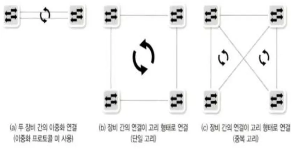 - SpoF를 피하기 위해 스위치 두 대로 네트워크를 디자인 하지만, 스위치 두 대로 디자인을 하면 패킷이 네트워크를 따라 계속 전송되므로 네트워크를 마비시킬 수 있음