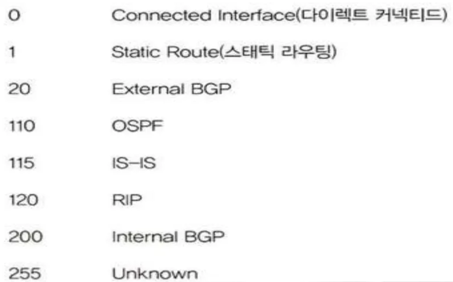 일반적인 경로 정보를 모아놓은 토폴로지 테이블에서 좋은 경로 정보의 우선수위는 경로 정보를 받은 방법과 거리를 기준으로 정함